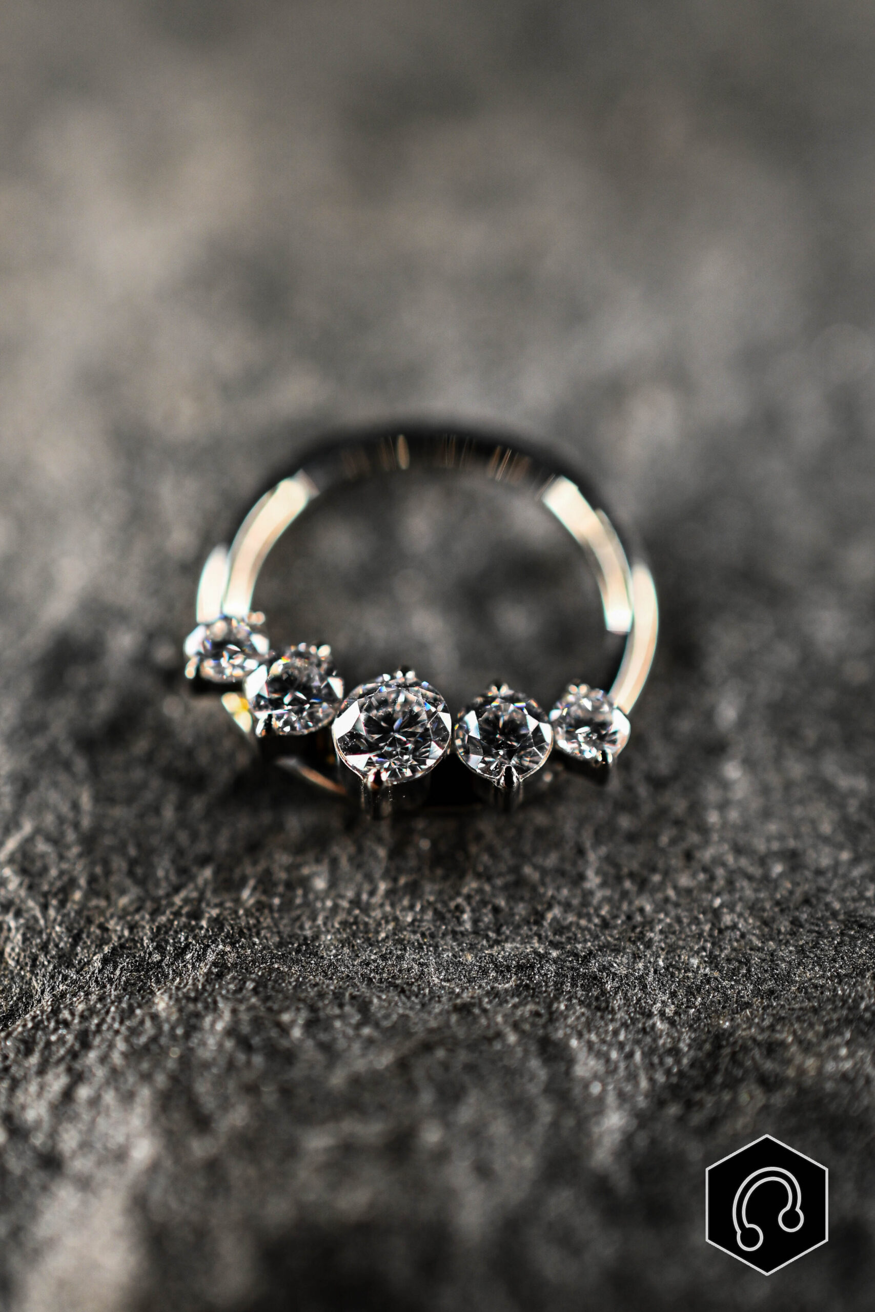 Minimaliste mais saisissant, l’anneau clicker titane argenté Cléa incarne l’équilibre parfait entre pureté et éclat. Ses cinq cristaux aux tailles dégradées sont soigneusement sertis pour capturer la lumière avec grâce et intensité.