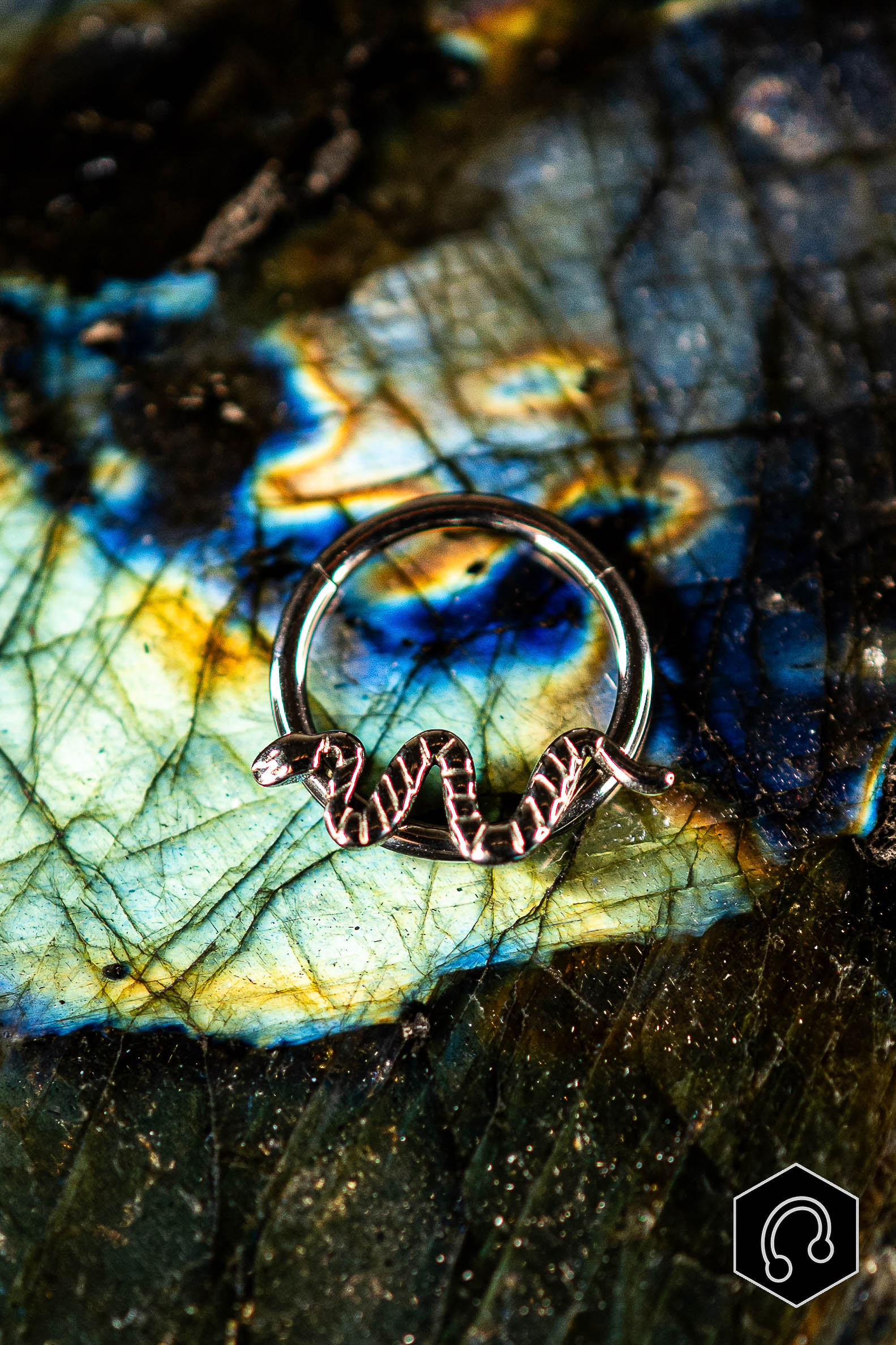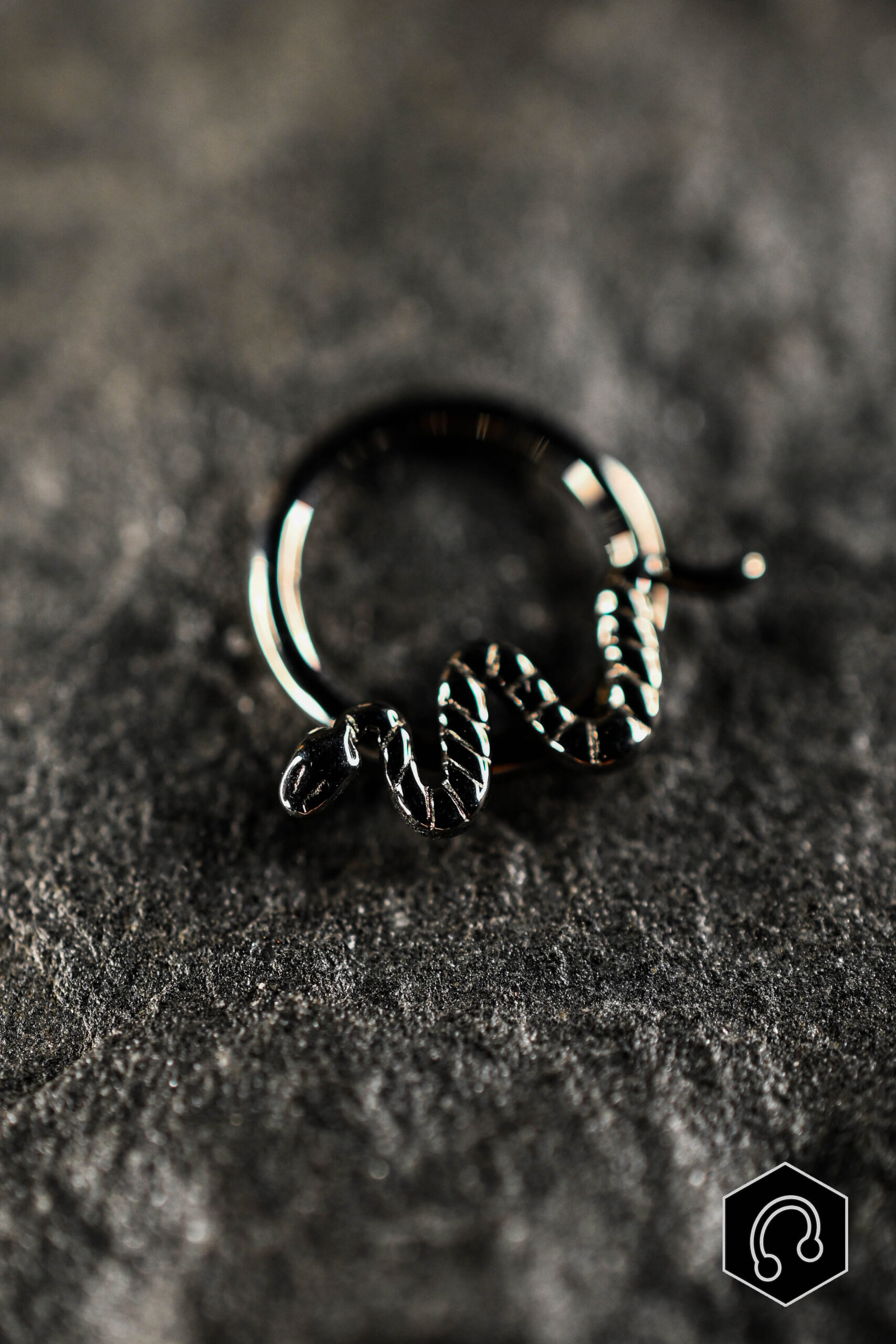 Polyvalent, l’anneau clicker titane argenté Cobra s’adapte à de nombreuses zones : septum, hélix, daith ou lobe. Son éclat et ses détails sculptés attirent la lumière et subliment le visage ou l’oreille avec une touche à la fois discrète et charismatique.