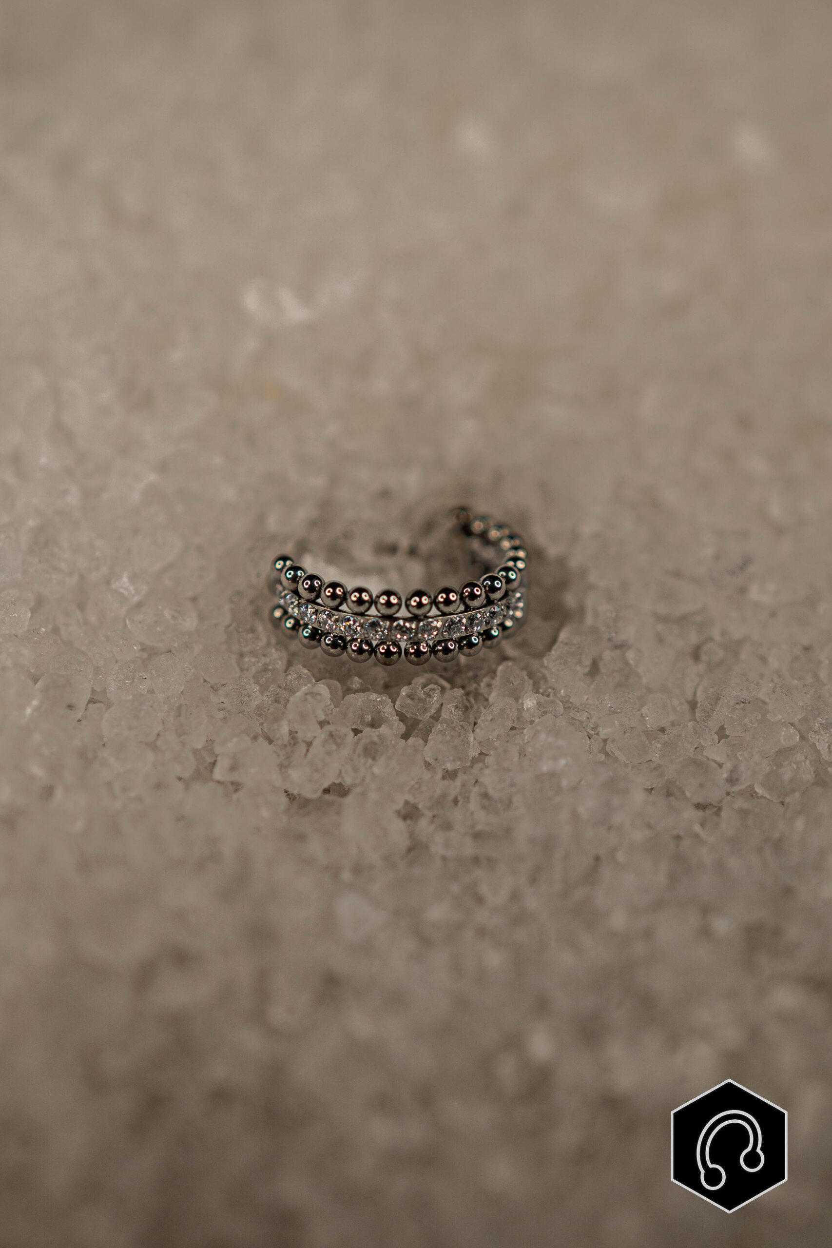 Sublimez votre piercing avec l’anneau clicker titane argenté Impérial, un bijou lumineux et raffiné composé de trois rangées harmonieuses : deux lignes de petites billes polies encadrant une rangée centrale de strass. Ce jeu de textures crée un contraste élégant, parfait pour celles et ceux qui souhaitent un bijou à la fois sophistiqué et moderne.