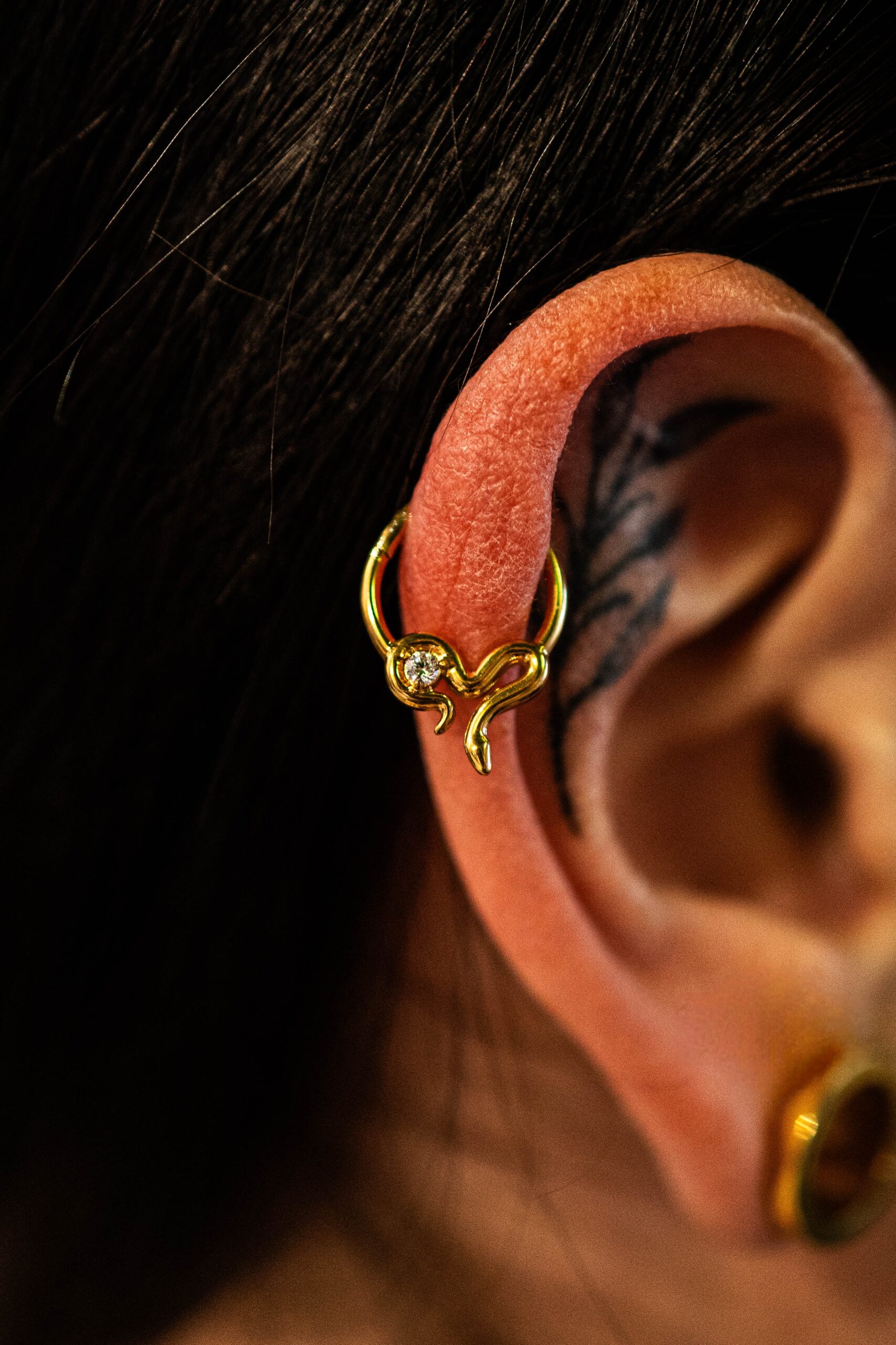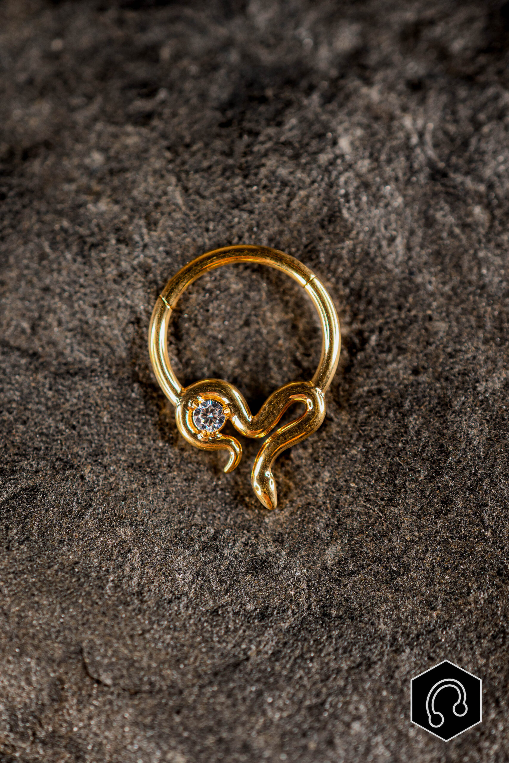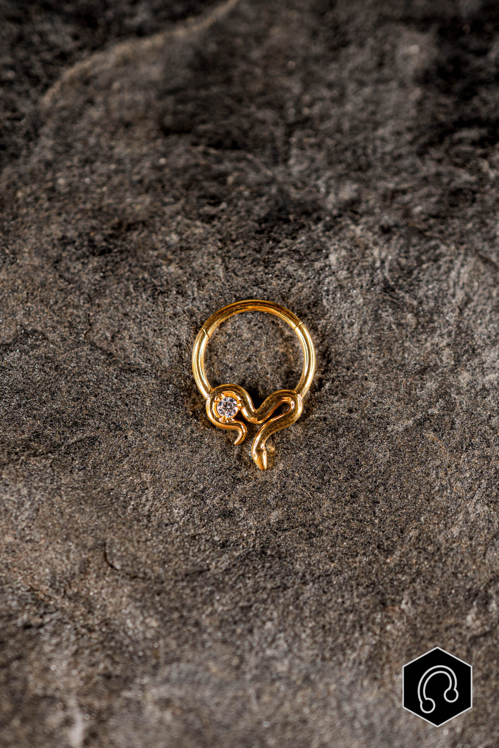 Affirmez votre style avec l’anneau clicker titane Serpenta Gold, un anneau en titane doré représentant un serpent délicatement enroulé autour de l’anneau. Son zircon clair apporte une petite touche lumineuse qui contraste parfaitement avec la finition dorée, pour un rendu à la fois élégant et audacieux.
