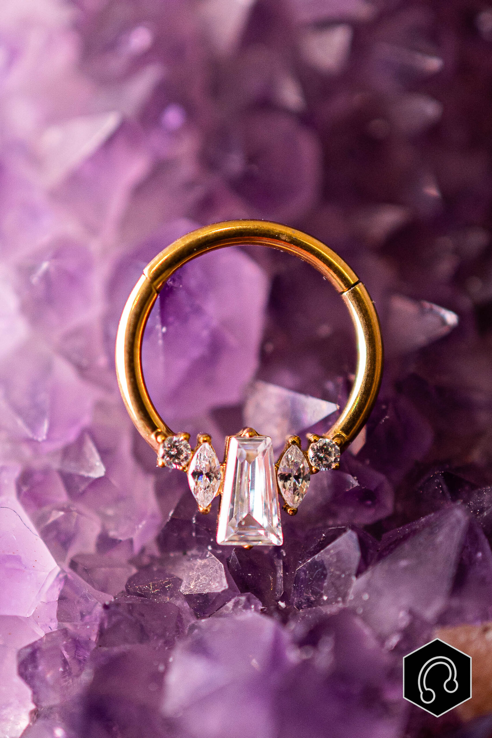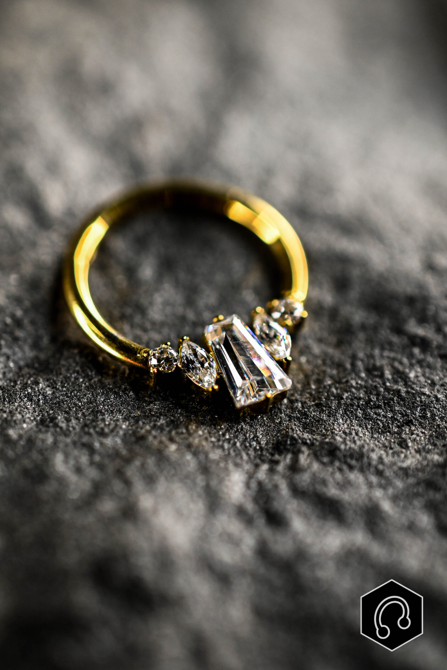 Laissez-vous séduire par l’élégance de l’anneau titane doré Prism Royal, un anneau clicker en titane, pensé pour sublimer vos piercings avec raffinement.