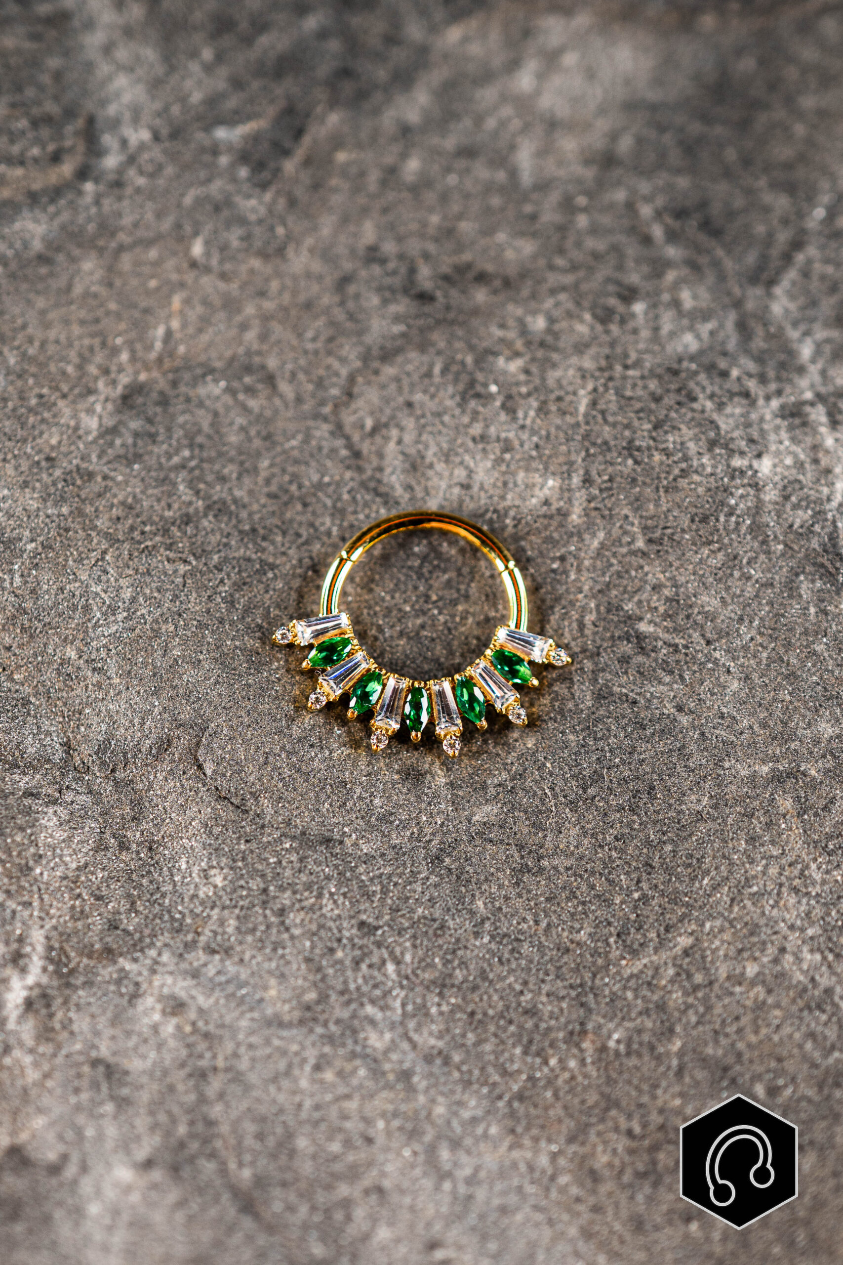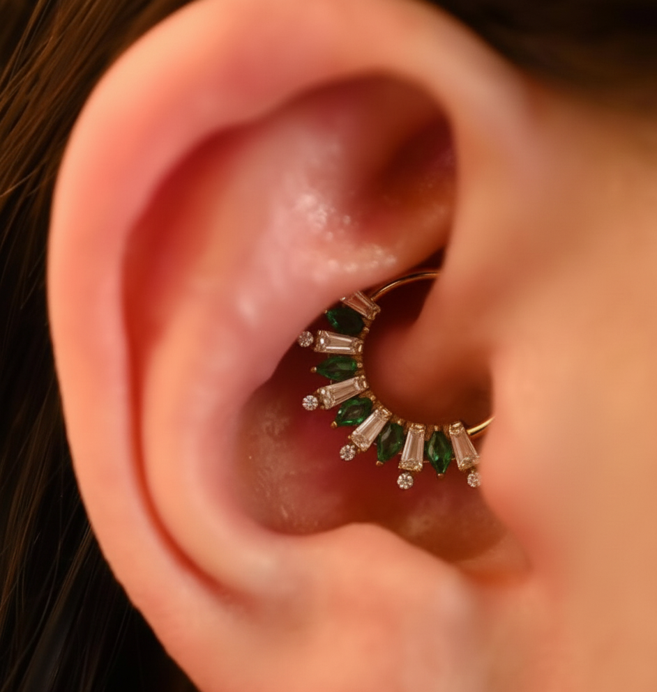 Son sertissage harmonieux associe des pierres taillées en baguette à des pierres plus délicates, créant un jeu de reflets subtil et équilibré. Chaque élément est pensé pour offrir un rendu visuel élégant et met en valeur le piercing avec finesse.