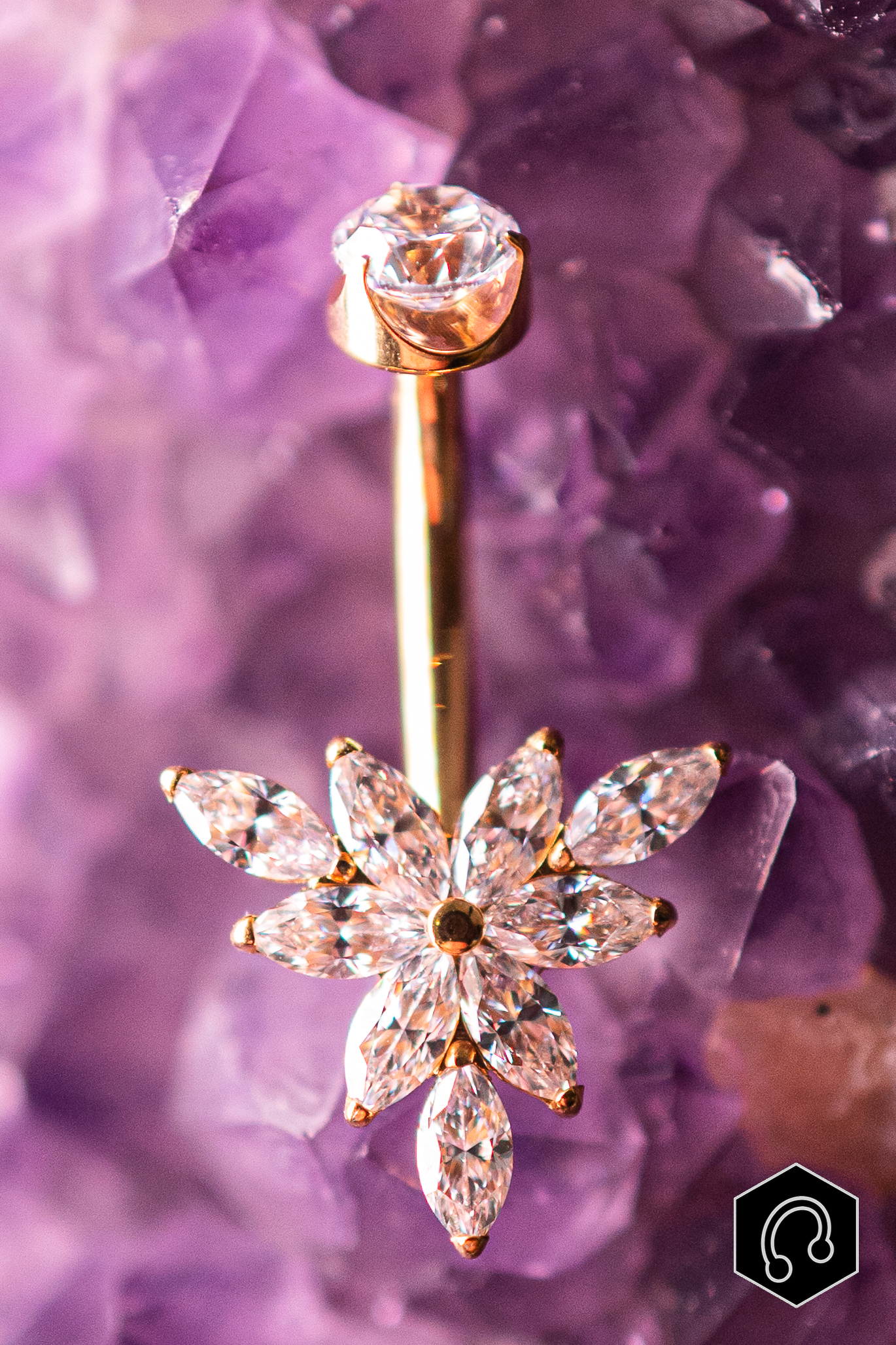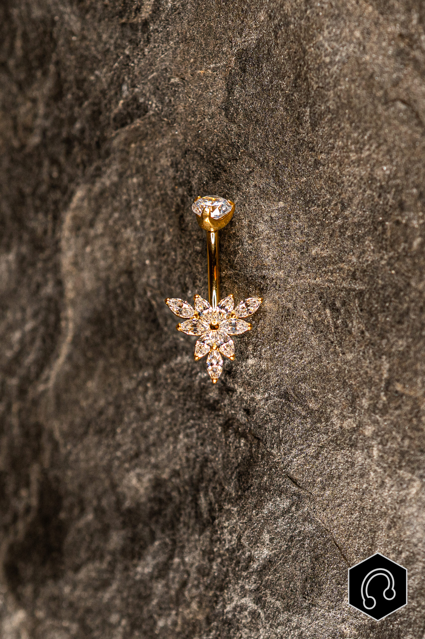 Cette banane de nombril en titane doré sublime votre nombril avec une fleur aux pétales scintillants, finement taillés en zircon marquise.