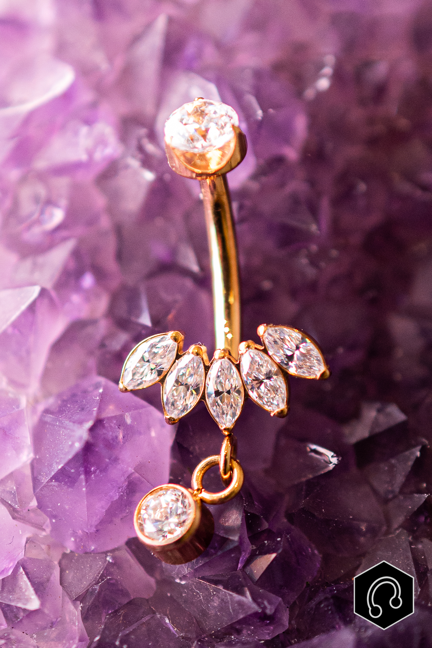 L’ensemble crée un jeu de lumière saisissant, donnant l’illusion d’une fleur ou d’une aile qui sublime le nombril avec féminité et éclat.