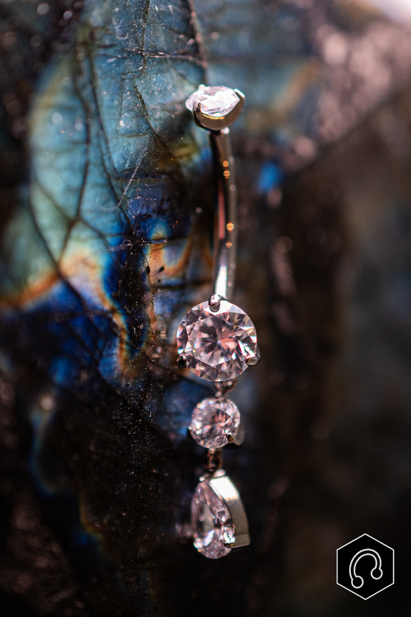 Cette banane de nombril joue sur les volumes et les reflets, avec une cascade de trois cristaux taillés.