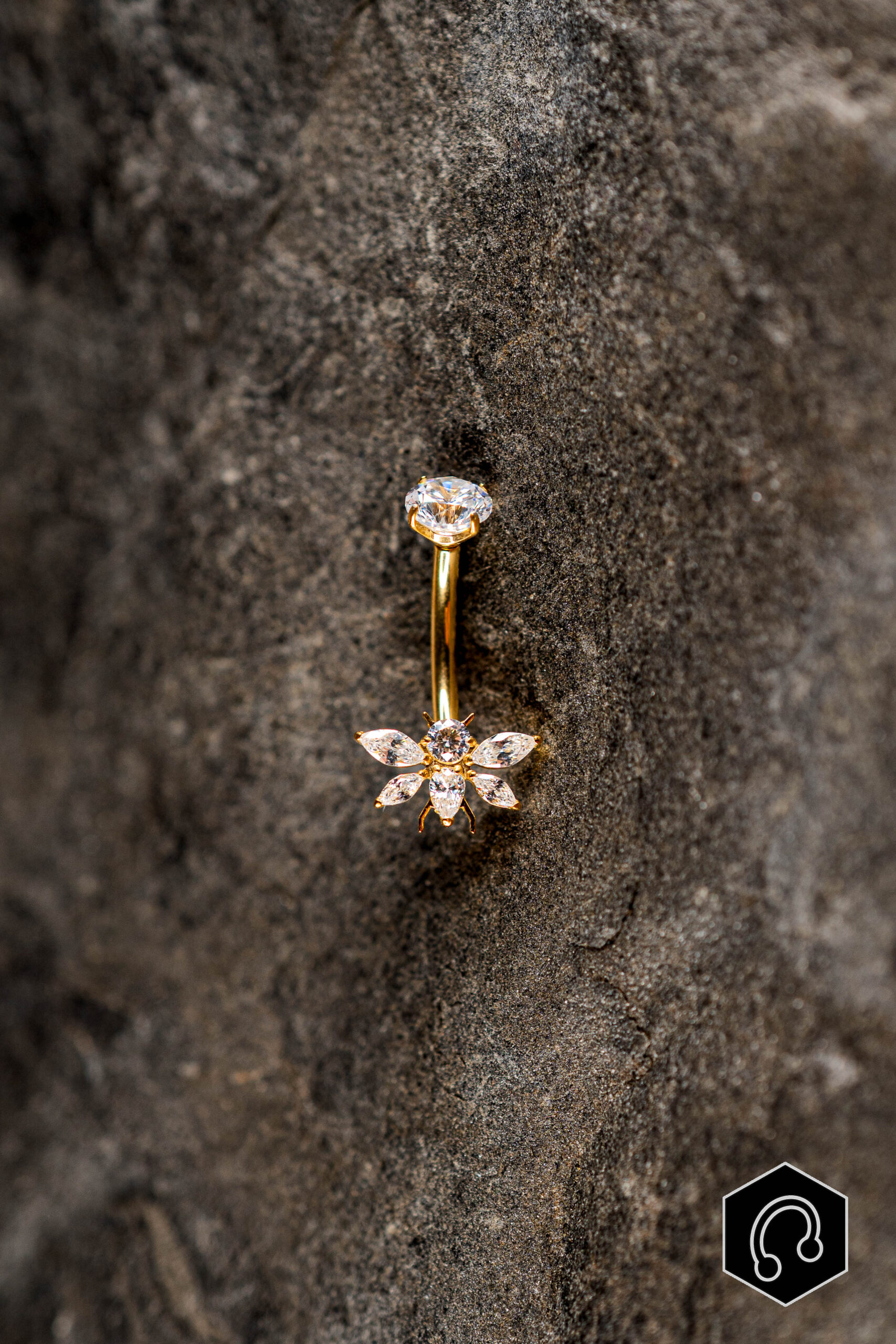 Apportez une touche lumineuse et délicate à votre piercing avec la banane nombril doré Honey Spark, ornée d’une élégante abeille sertie de zircons clairs. Son design raffiné est composée de zircons taillés avec précision pour un rendu brillant et sophistiqué. Un bijou à la fois fin, original et parfaitement adapté à un port quotidien.