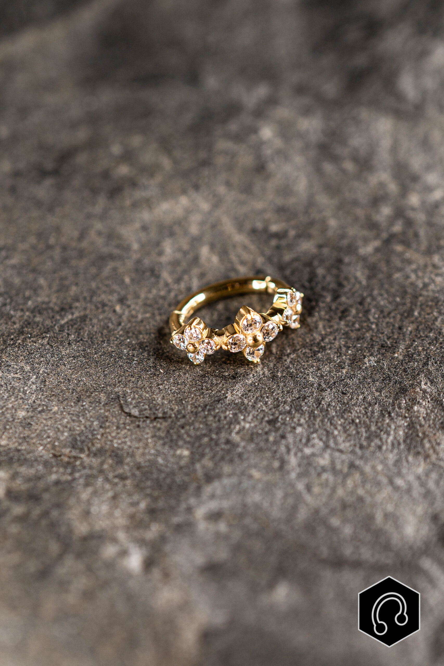La banane ovale nombril Aureva en CoCr PVD Gold séduit par son design élégant et parfaitement équilibré. Composé de zircons clairs disposés en motifs floraux délicats, il offre un éclat lumineux et raffiné qui capte subtilement la lumière.