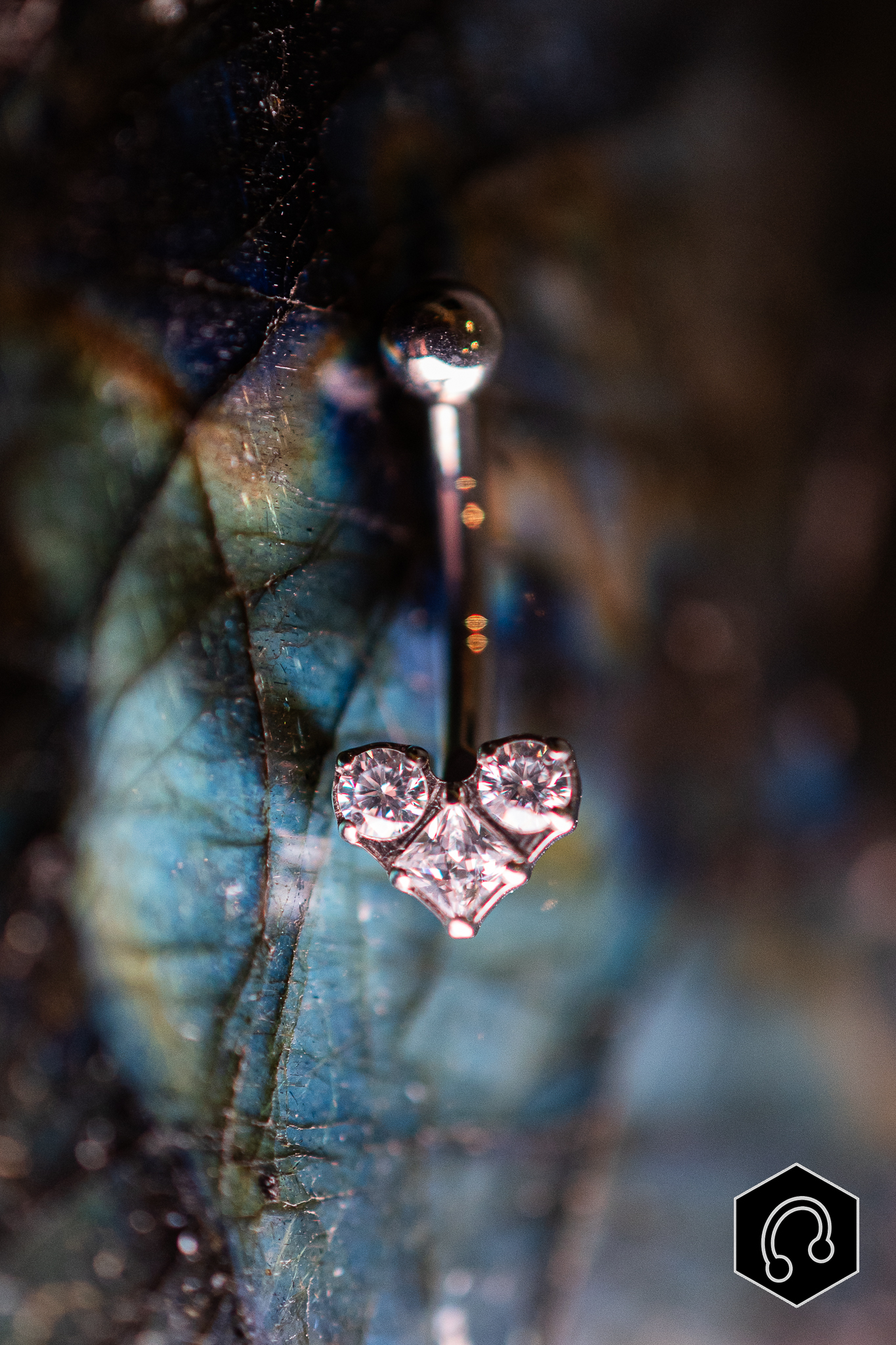 Minimaliste et lumineuse, la banane de rook Trinity Shine marie la pureté du titane à l’éclat de trois strass, subtilement agencés en une pointe inversée.