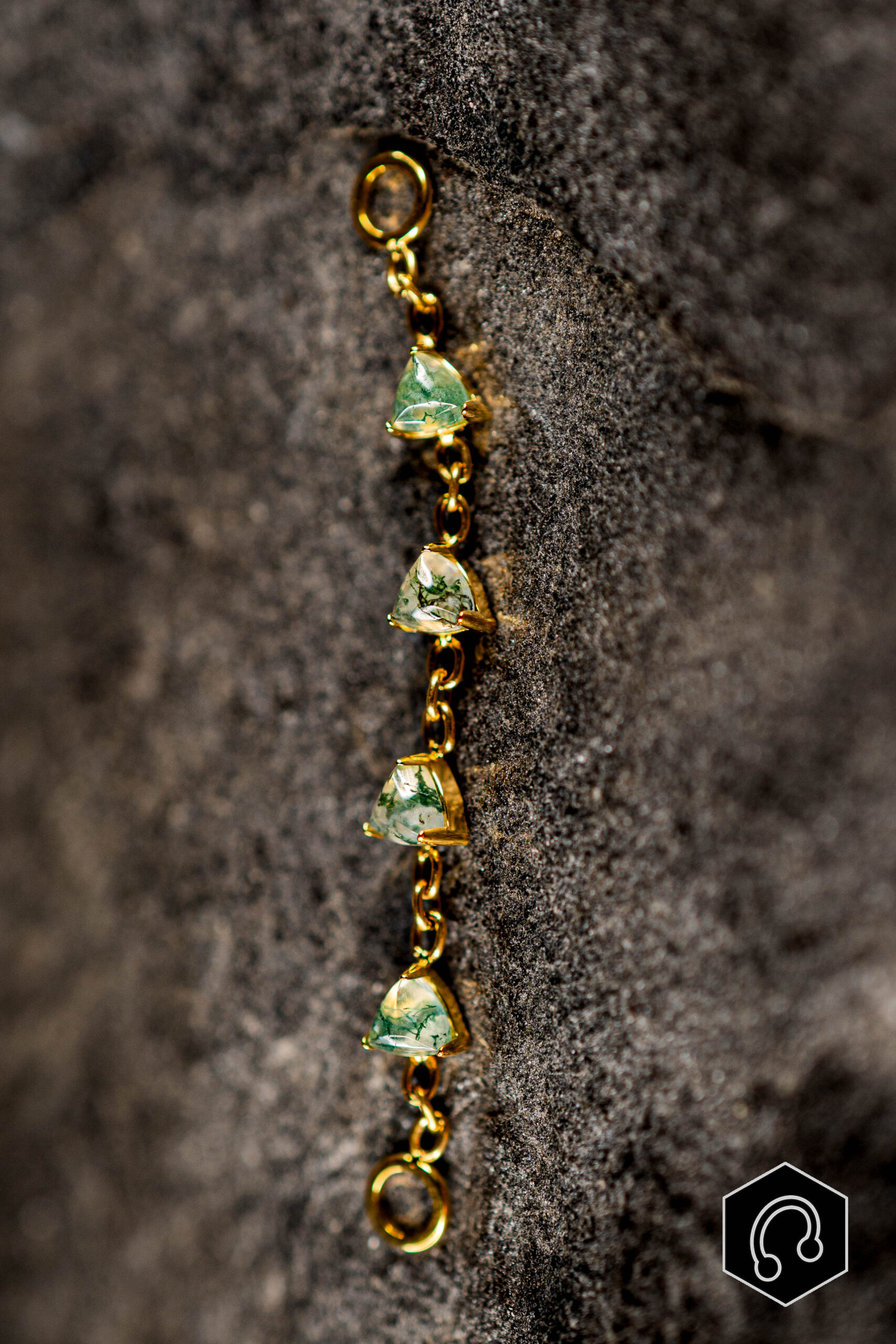 Sublime ton piercing avec la chaine doré pierres triangles Agate Moss, hypoallergénique ornée de pierres naturelles.
