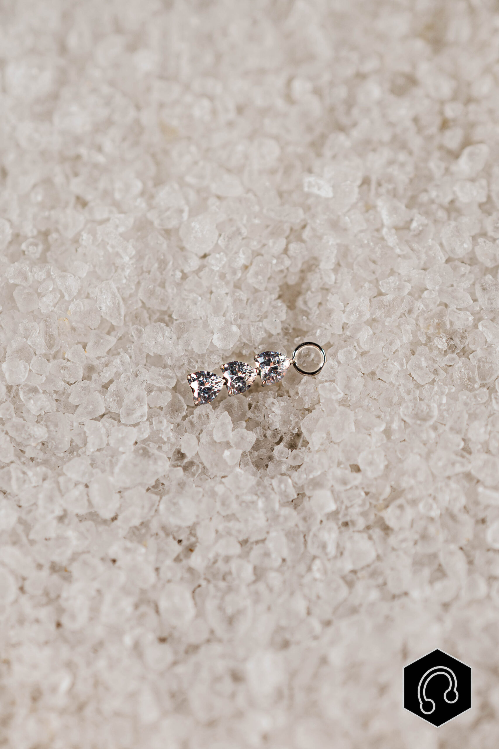 Le charm titane argenté Tria Heart séduit par son design délicat et romantique. Composé de trois zircons en forme de cœur, il apporte une touche lumineuse et élégante à tous les piercings.