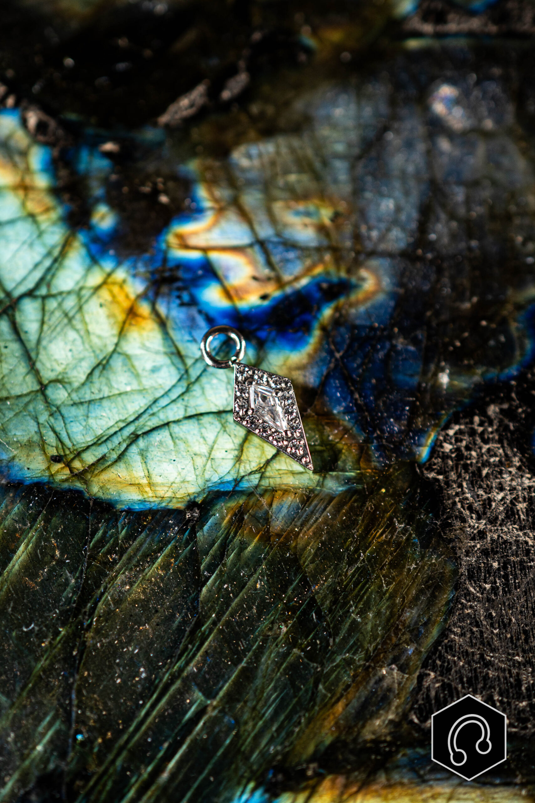 Sa forme en losange, sublimée par une pierre taillée avec précision et bordée de zircon étincelants, capte la lumière à chaque mouvement.