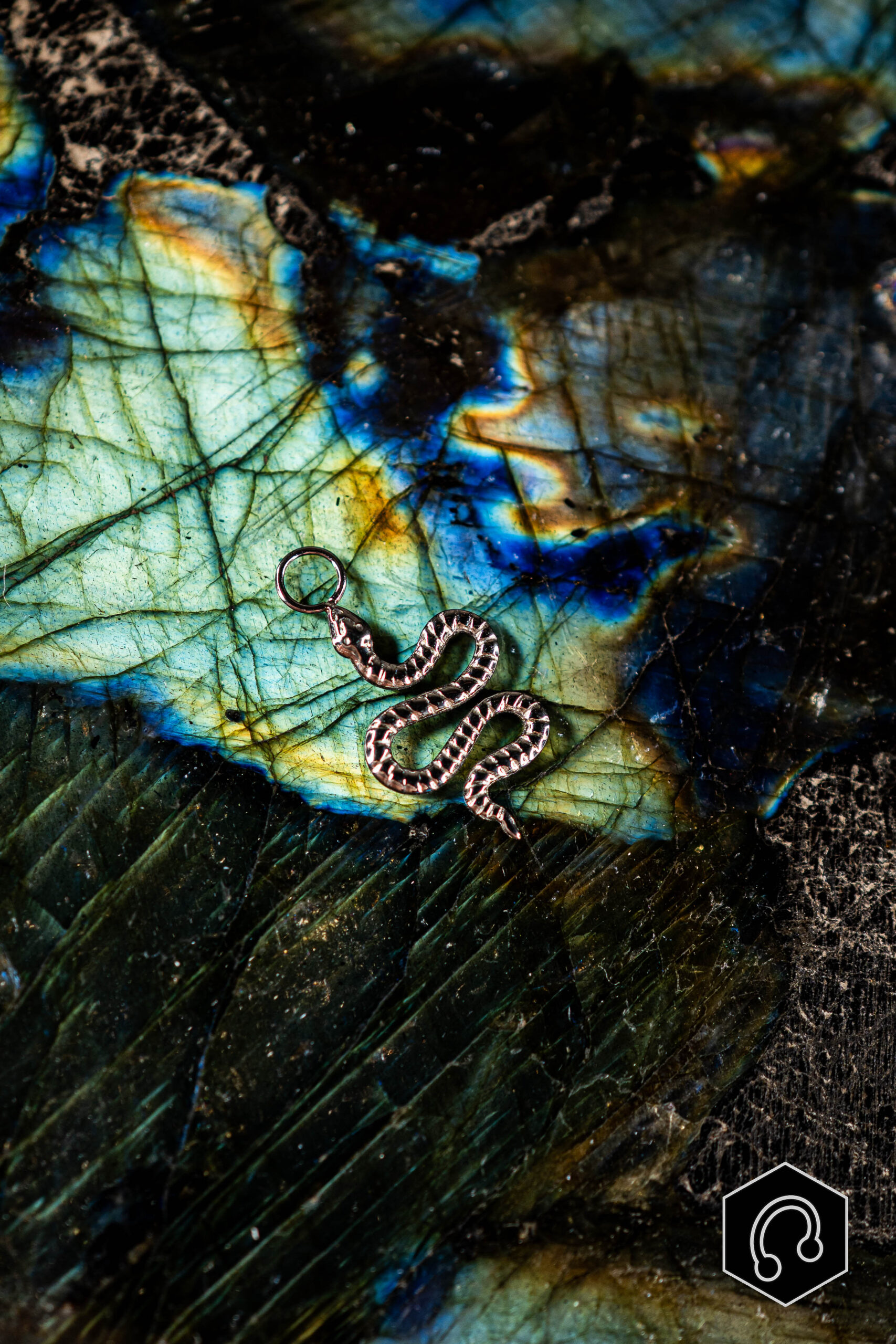 Ce charm en titane incarne la puissance et la sensualité du serpent, symbole ancestral de transformation et de protection.