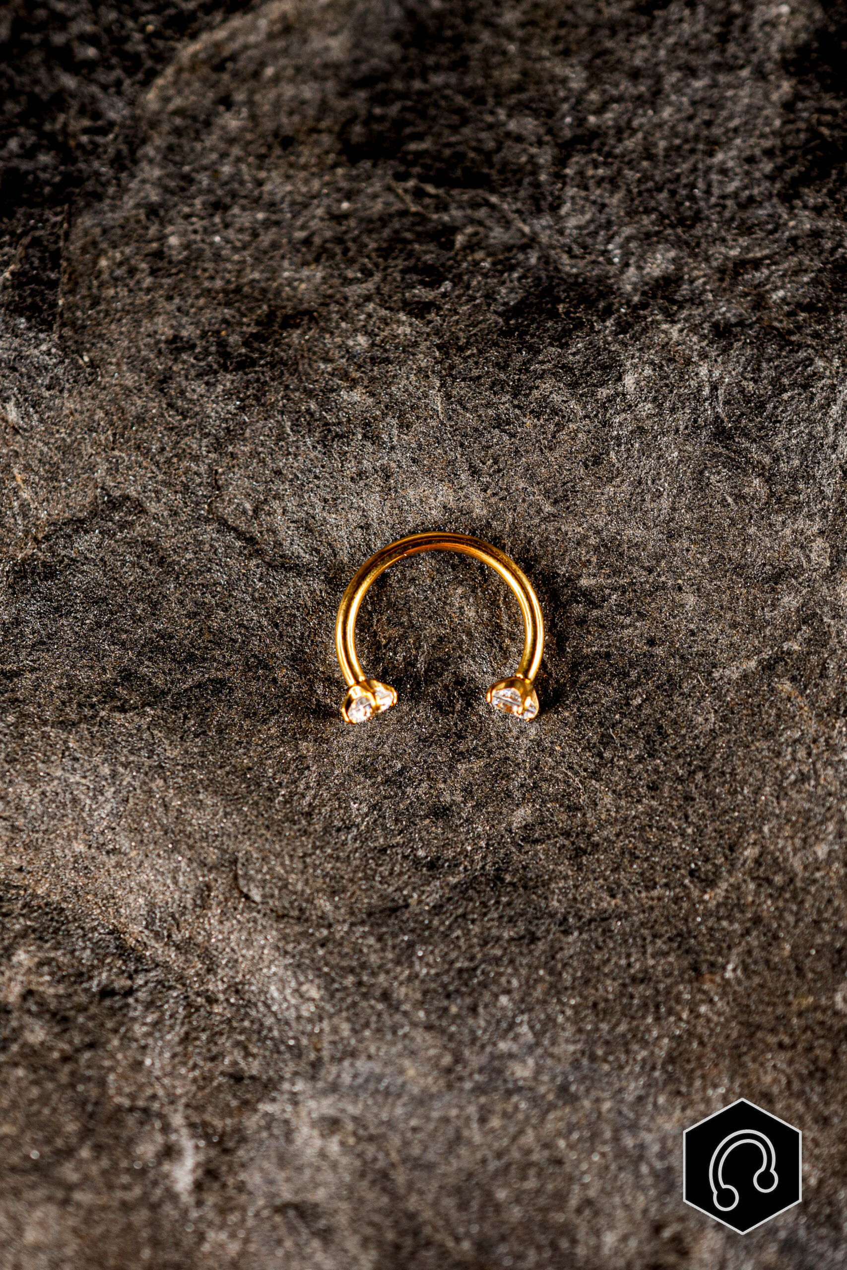 Le fer à cheval titane doré Elenya Duo séduit par son design épuré et équilibré, sublimé par deux strass délicatement sertis à chaque extrémité. Discret et raffiné, il apporte une touche de brillance tout en conservant une esthétique minimaliste, idéale pour un port quotidien.