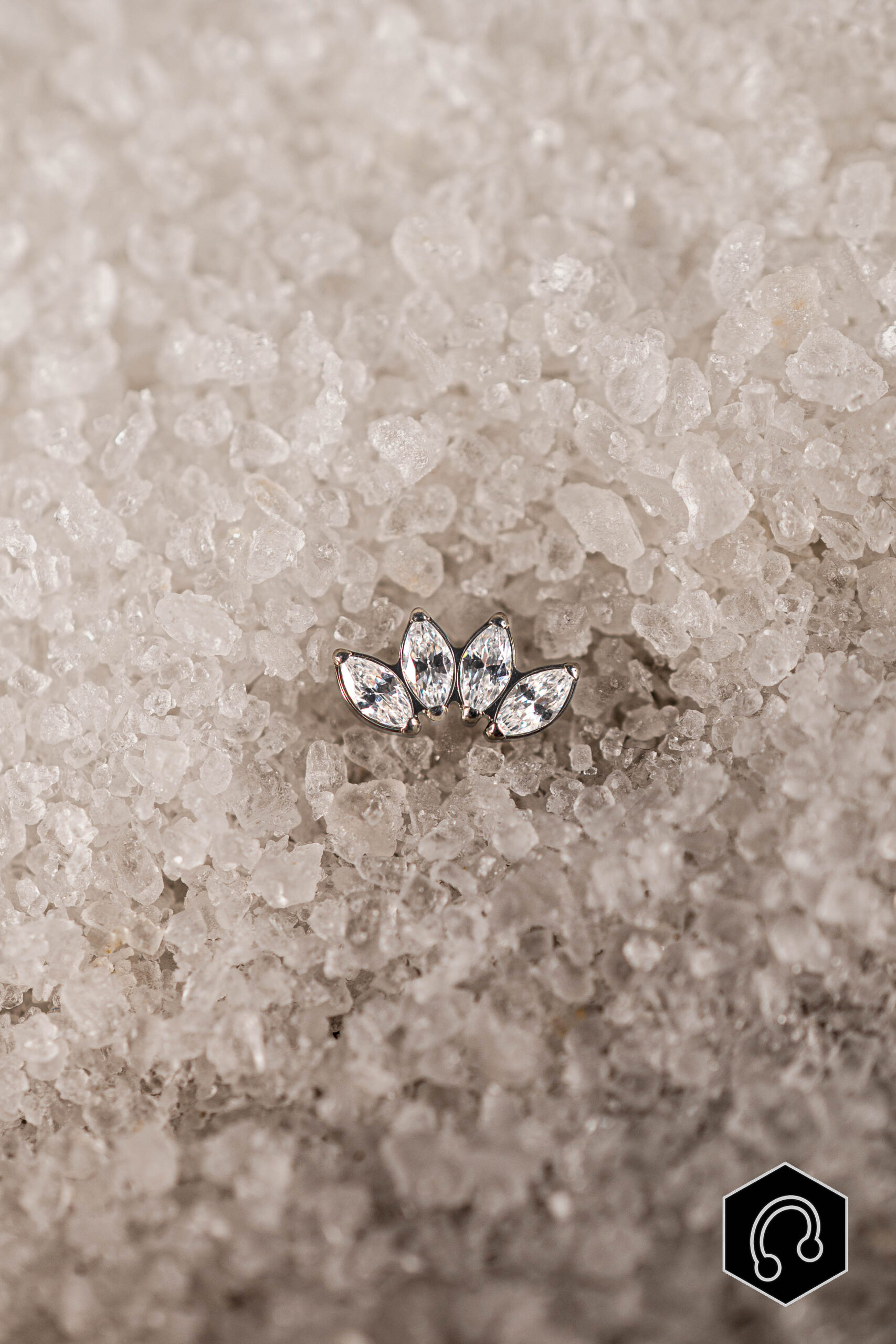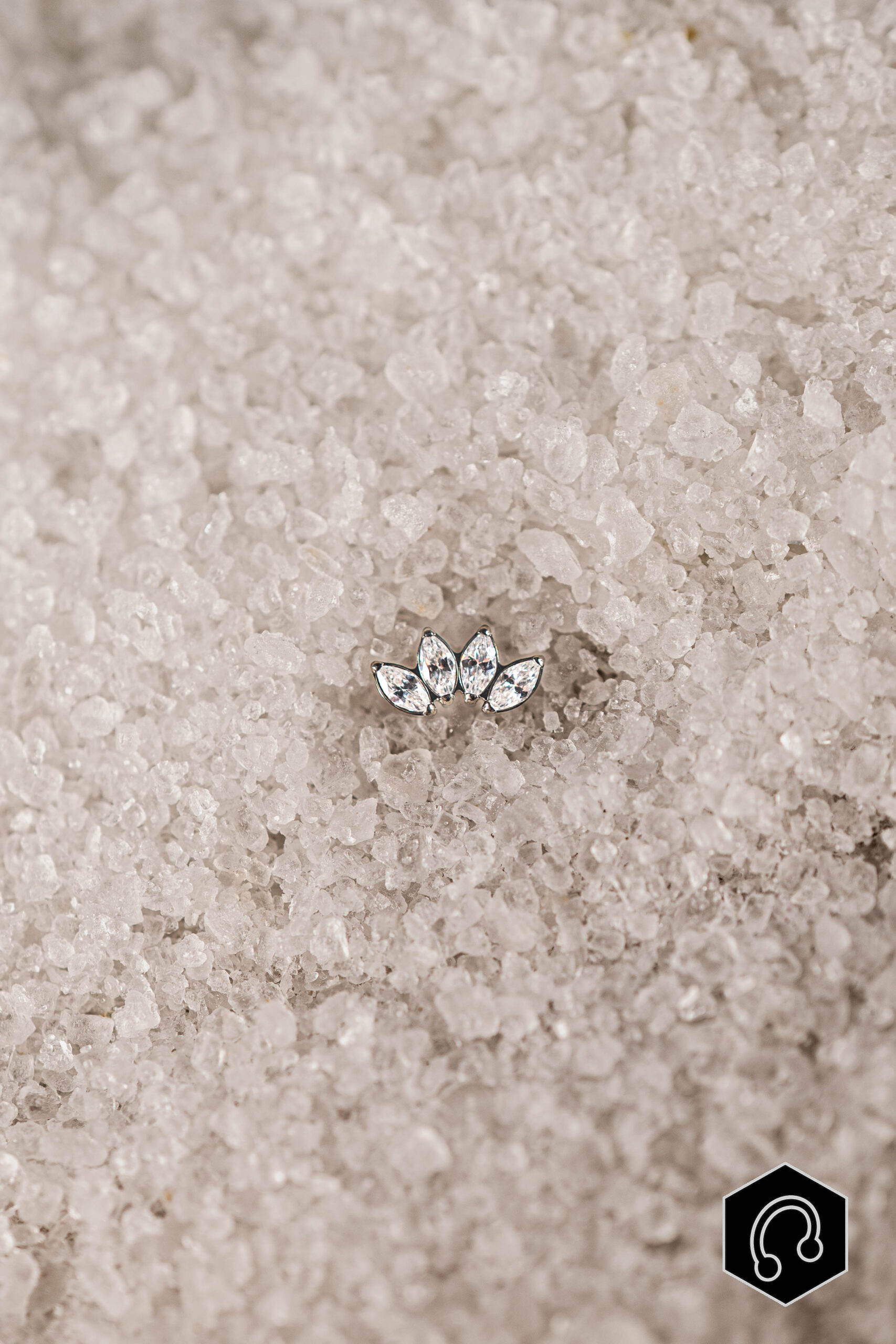 Le labret Aurelian Crest quatre strass est raffiné et parfaitement équilibré. Sa rangée de zircons clairs taillés en marquise forme une ligne délicate et lumineuse, offrant un rendu élégant sans être trop imposant.