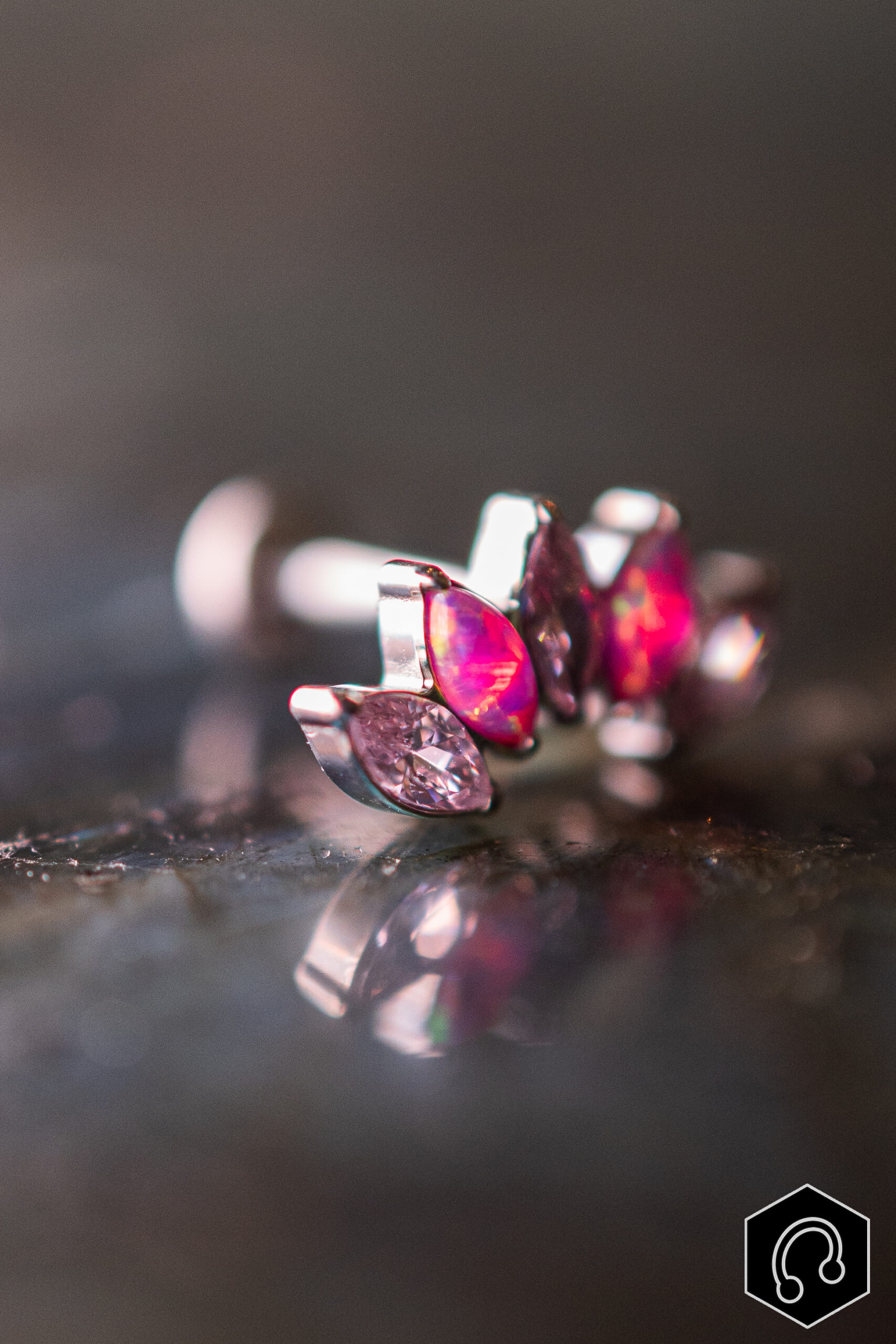 Ce labret en titane de qualité implantable allie légèreté, résistance et élégance. Son design en éventail floral met en valeur deux opales synthétiques aux reflets envoûtants, encadrées de zircons taille marquise au rose délicat.