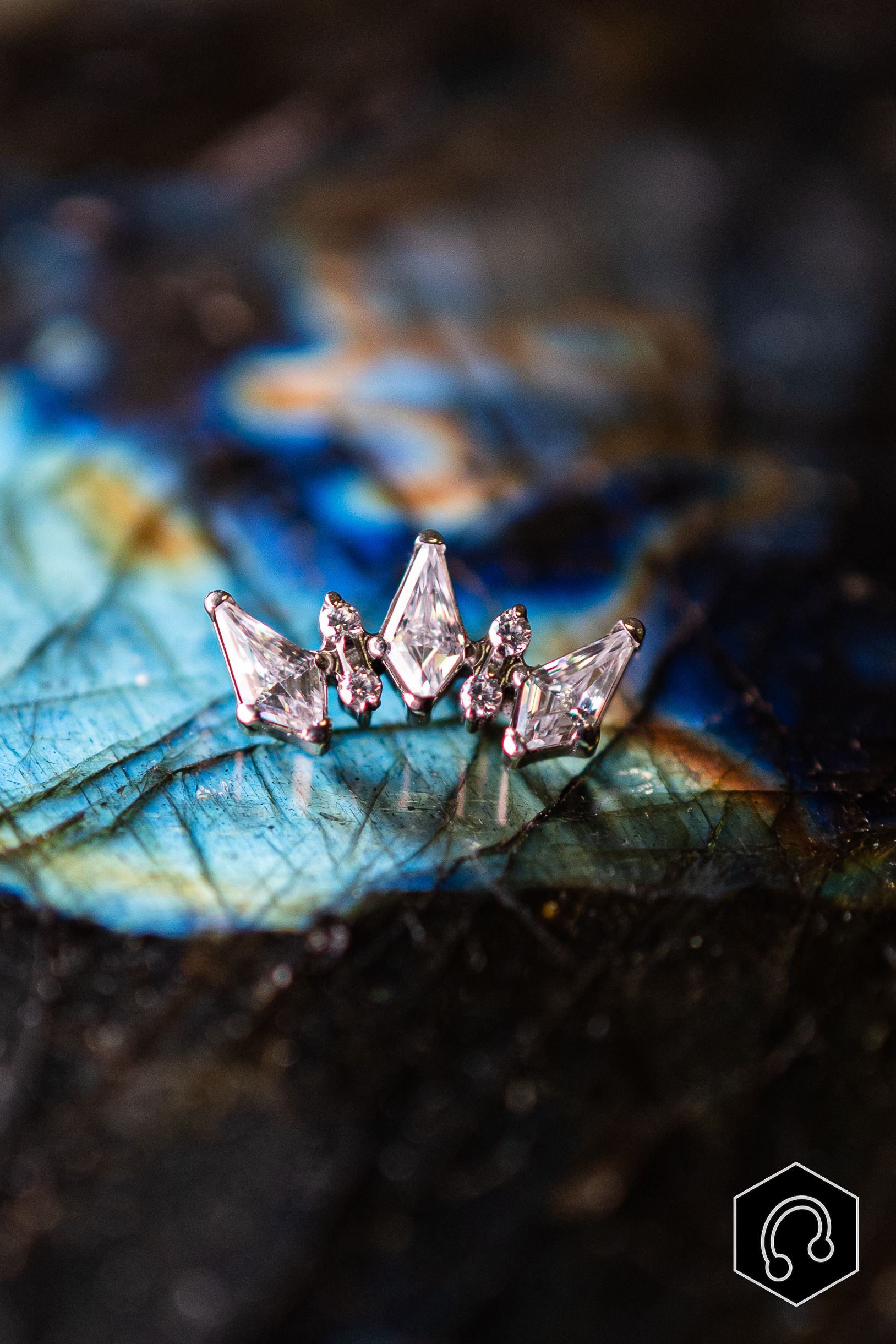 Offrez à votre piercing une allure royale avec le Crystal Crown, un labret en titane orné de trois zircons taille géométrique, encadrés de pierres plus fines pour un éclat maximal.