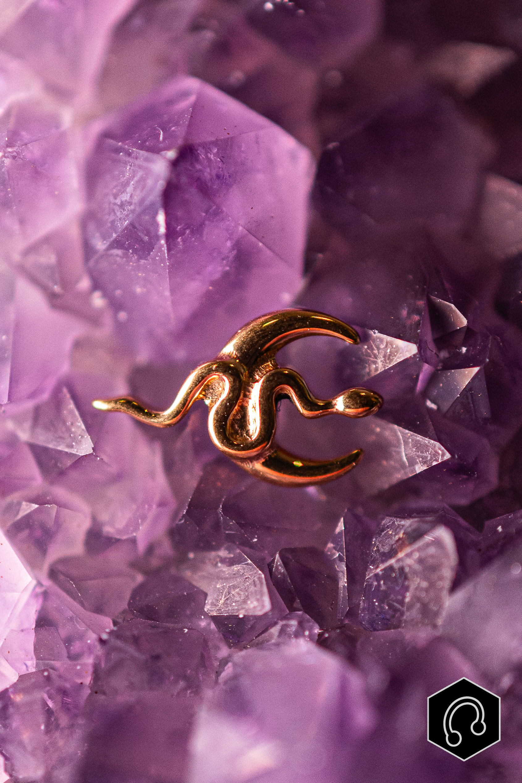 Ce labret en titane de haute qualité arbore un design hypnotisant : un serpent enlacé autour d’un croissant de lune, symbole d’intuition et de renouveau.
