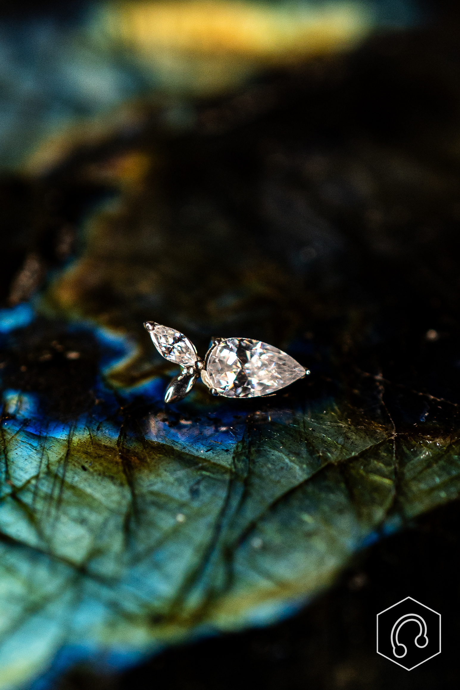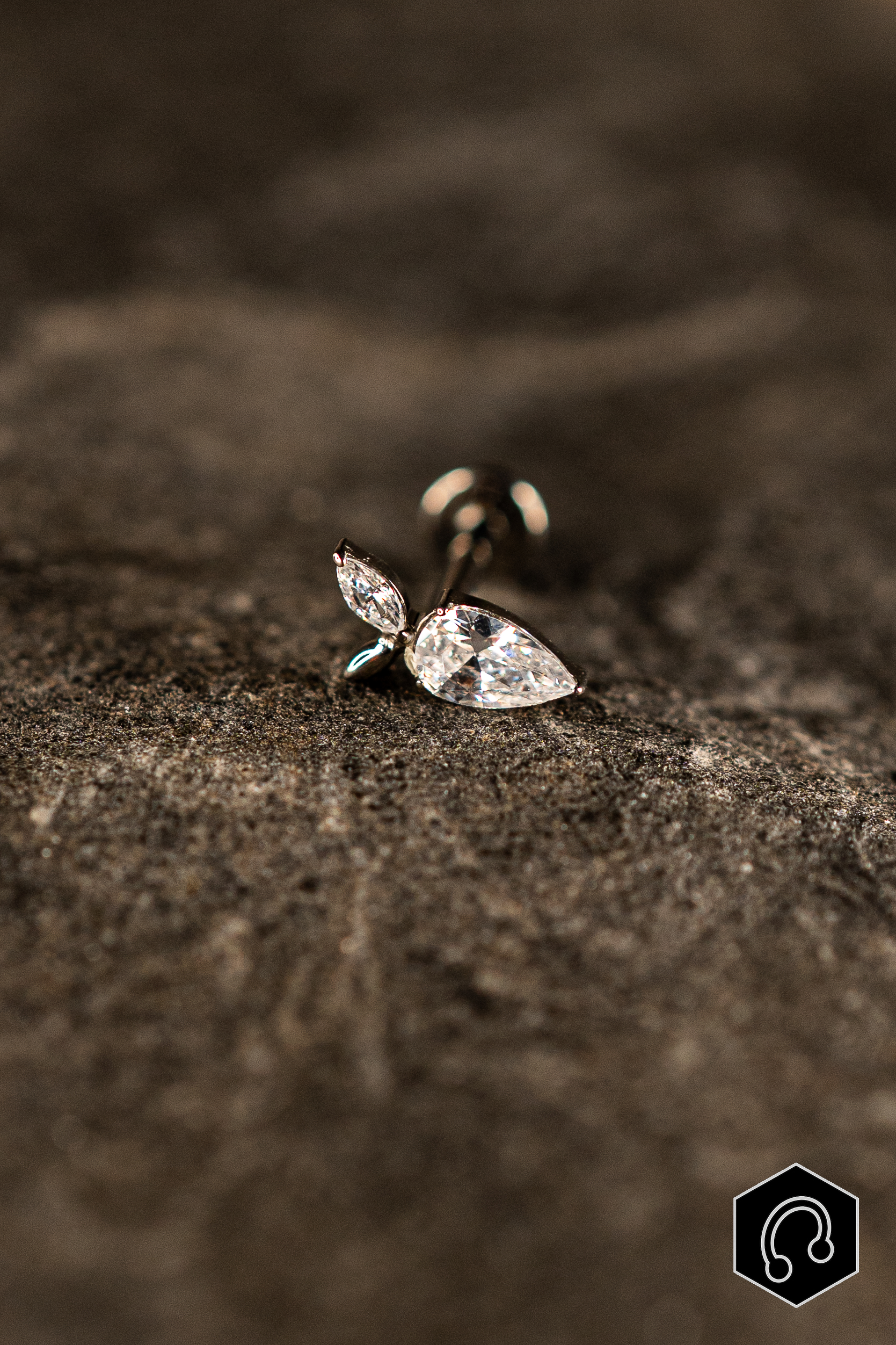 Ce labret en titane allie finesse et caractère grâce à son trio de pierres taillées en goutte et en marquise, formant un motif élégant et harmonieux.