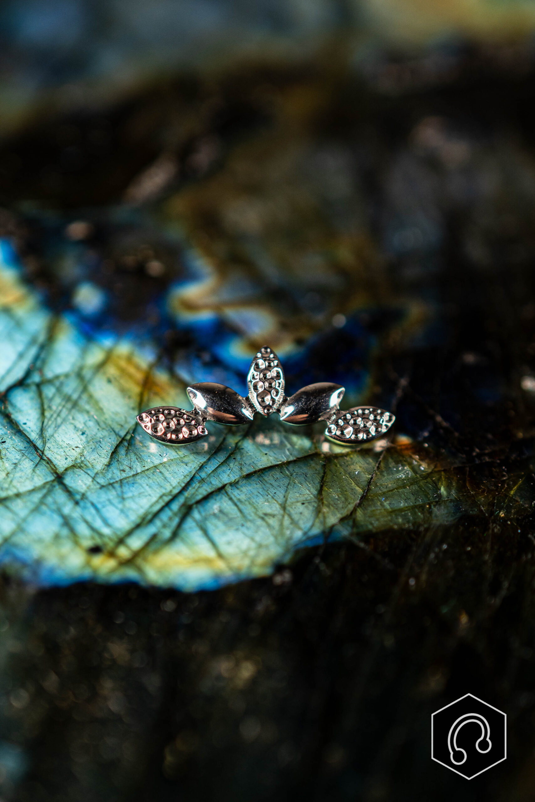 Plongez dans l’essence brute de la nature avec le labret Terra Nova. Son design martelé en forme de feuilles évoque les textures organiques de la terre, des roches et des plantes, pour un look à la fois sauvage et sophistiqué.