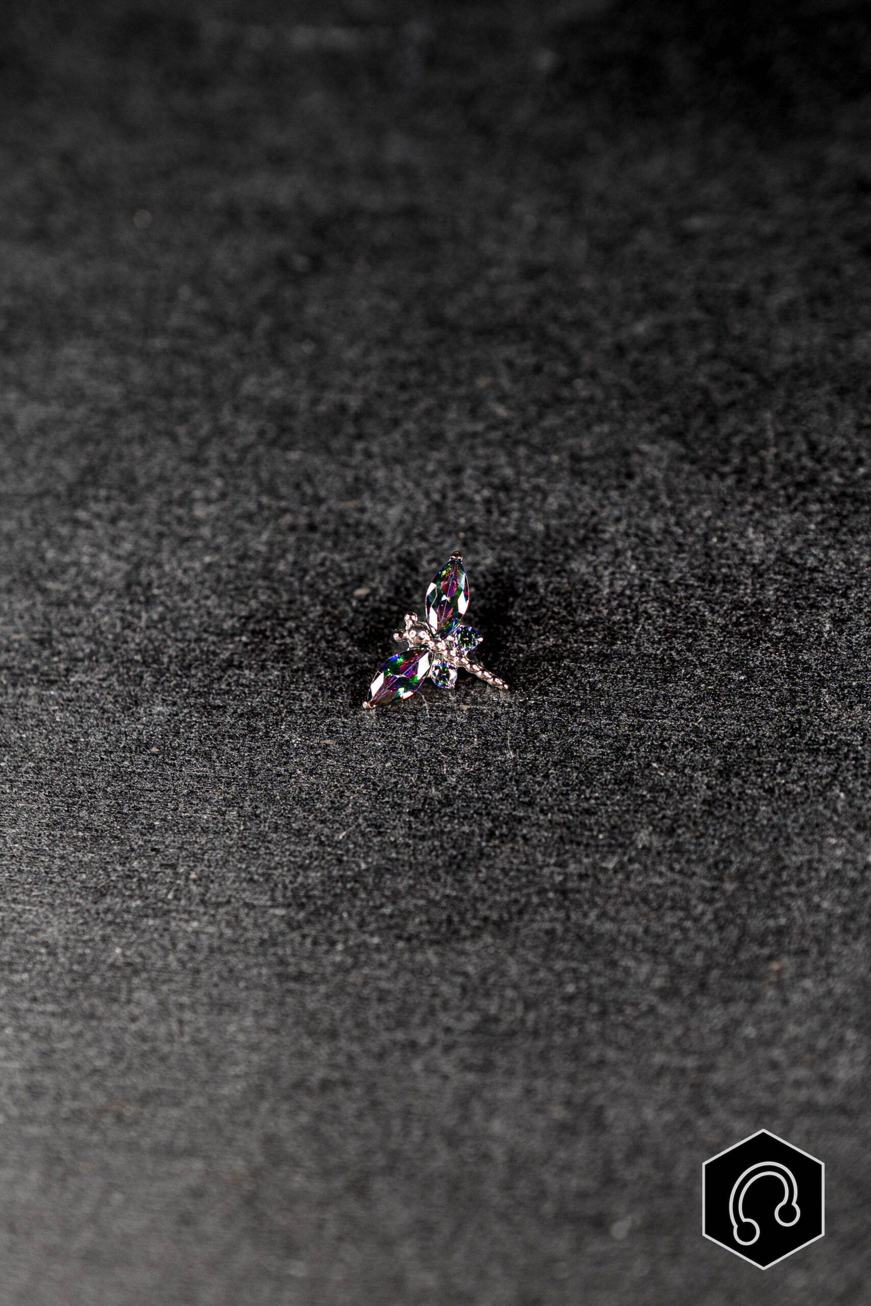 Apportez une touche lumineuse et raffinée à votre piercing avec le labret titane argenté Libellia vitrail, représentant une fine libellule ornée de zircons clairs. Ses ailes élancées en pierres taille marquise, associées à de petits zircons ronds, créent un jeu de lumière subtil et élégant. Le design finement travaillé met en valeur la silhouette aérienne de la libellule, symbole de légèreté et de finesse. La composition reste harmonieuse et équilibrée, idéale pour illuminer l’oreille.