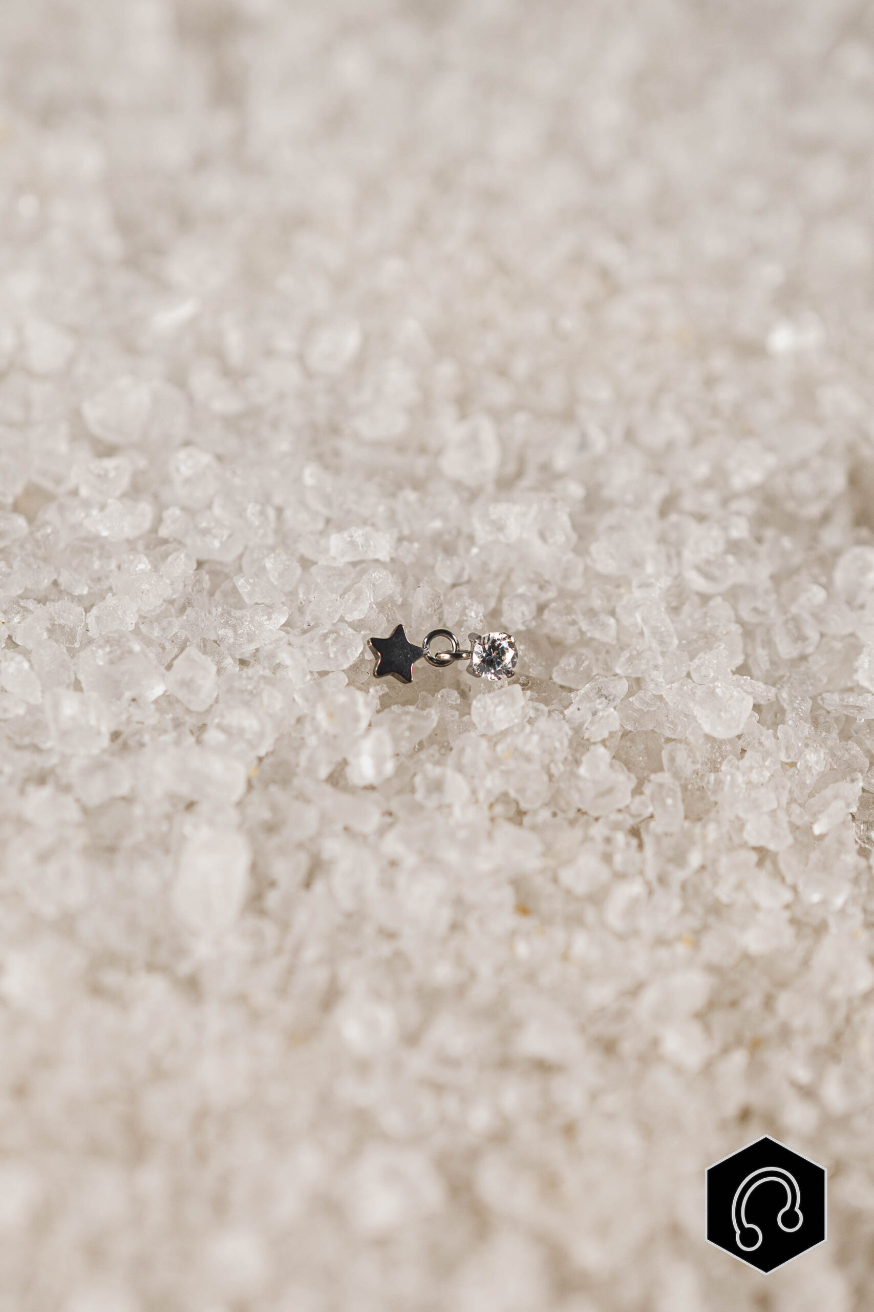 Le labret titane argenté Lyra Five se distingue par son design délicat, il associe un petit zircon griffé à un pendant étoile. Cette composition apporte du mouvement et une touche originale, tout en conservant une grande élégance.
