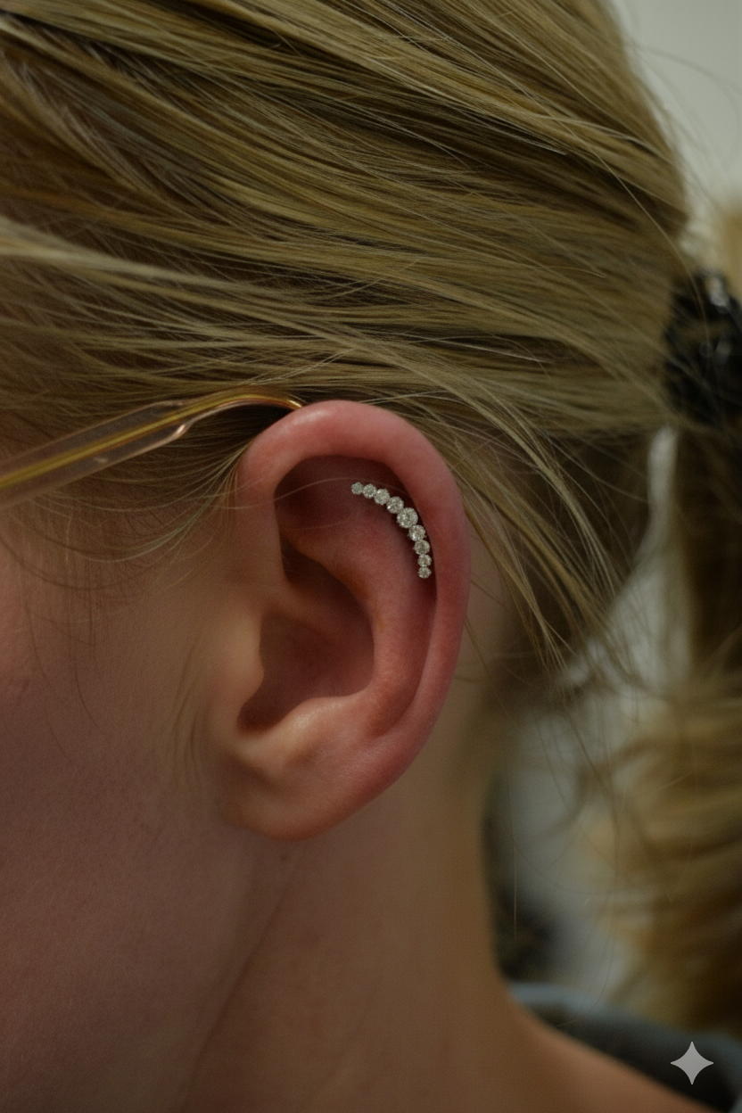 Orné d’une rangée de cristaux taillés avec précision, il épouse les courbes de l’oreille avec une élégance fluide et moderne. Sa disposition en dégradé apporte une touche de sophistication discrète, idéale pour sublimer chaque mouvement.