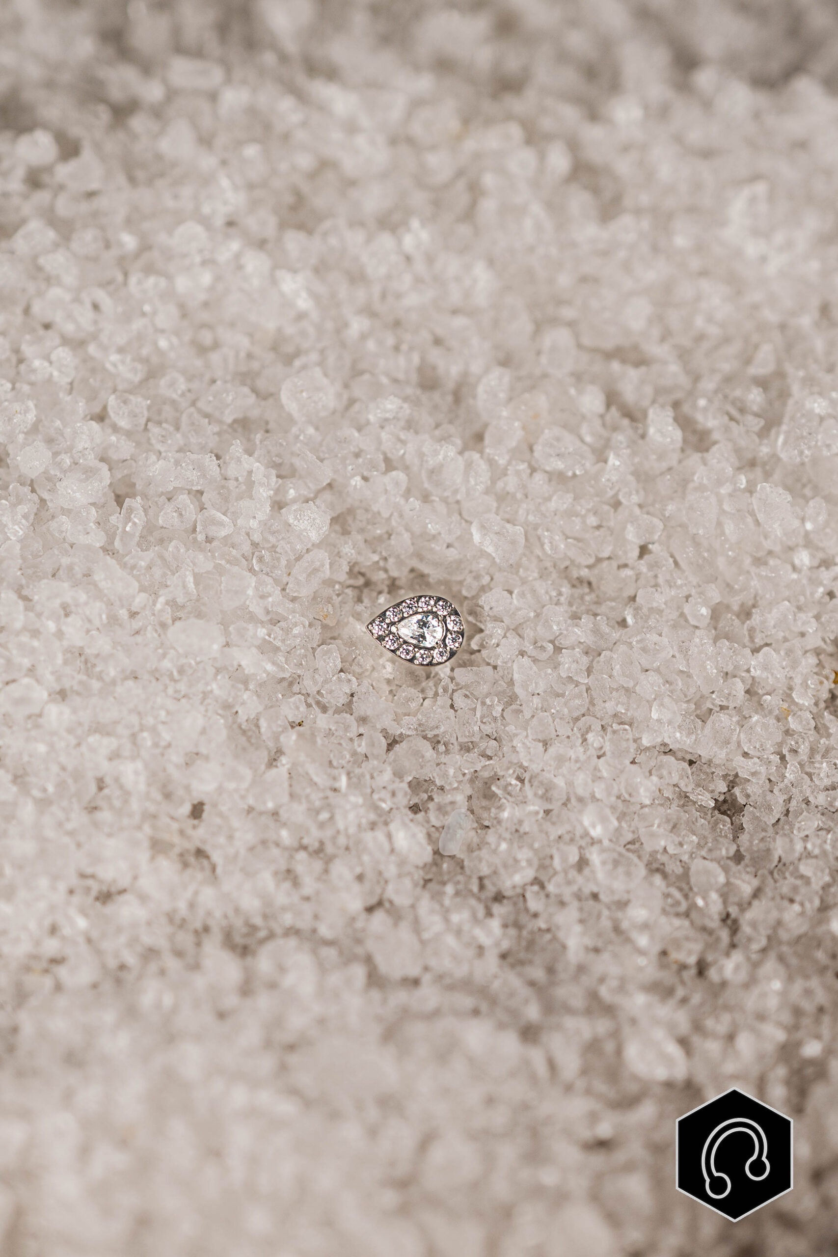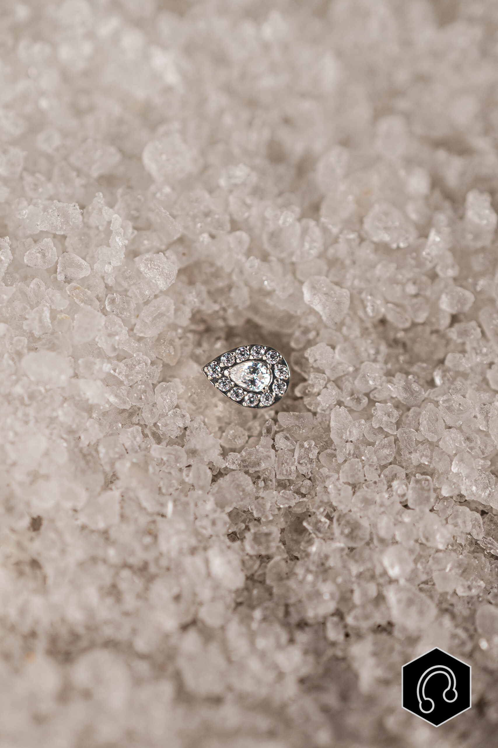 Le labret titane argenté Tear met en valeur une pierre en forme de goutte, sublimée par un halo de zircons.