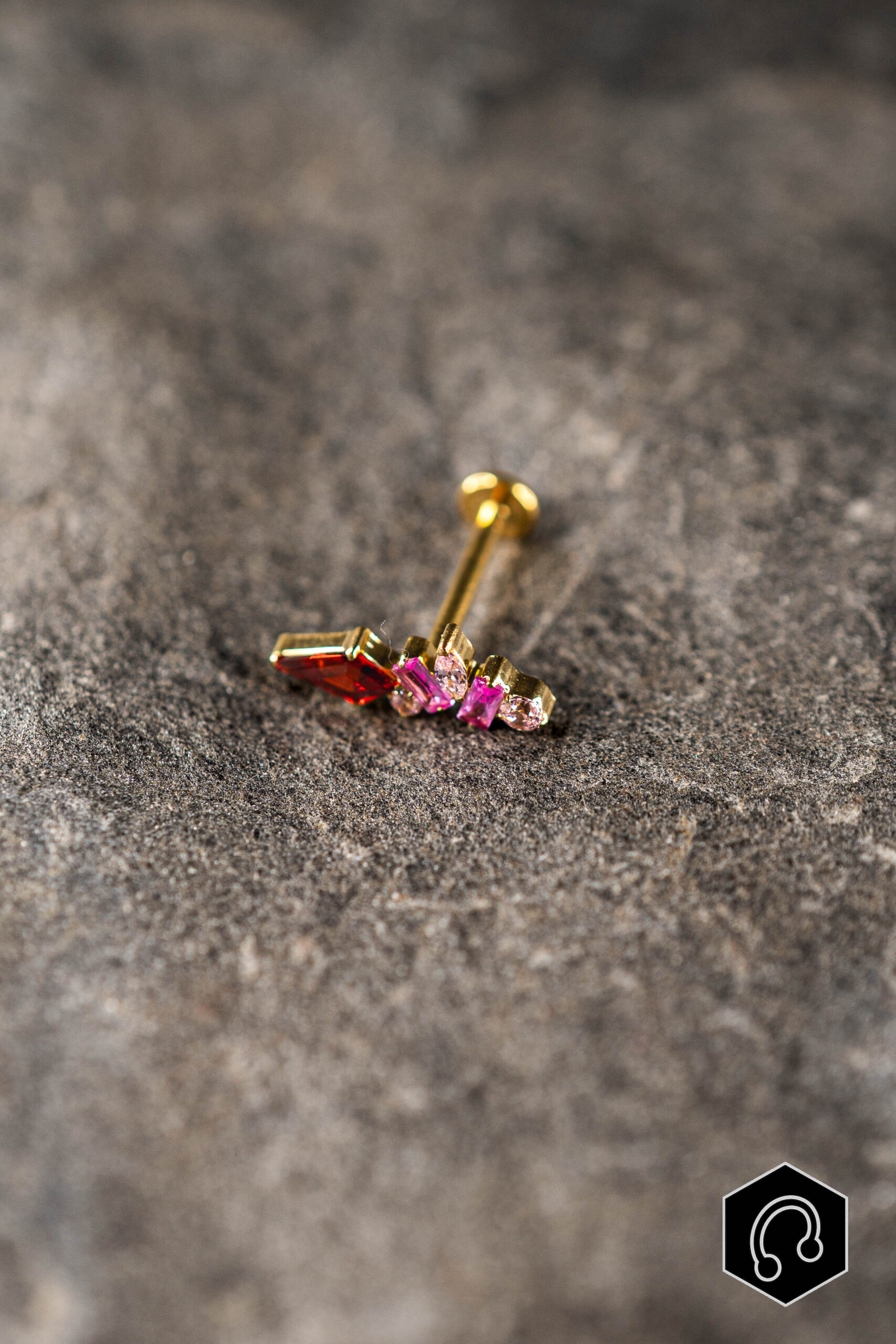 Le labret titane doré Auryx rose séduit par son design graphique et élégant. L’agencement structuré des pierres crée un jeu de lumière subtil, offrant un rendu à la fois moderne et raffiné. Sa finition dorée met en valeur l’éclat des zircons tout en conservant une grande finesse. Discret et lumineux, Auryx rose est idéal pour sublimer les piercings du cartilage ou du lobe, porté seul ou en association avec d’autres bijoux.