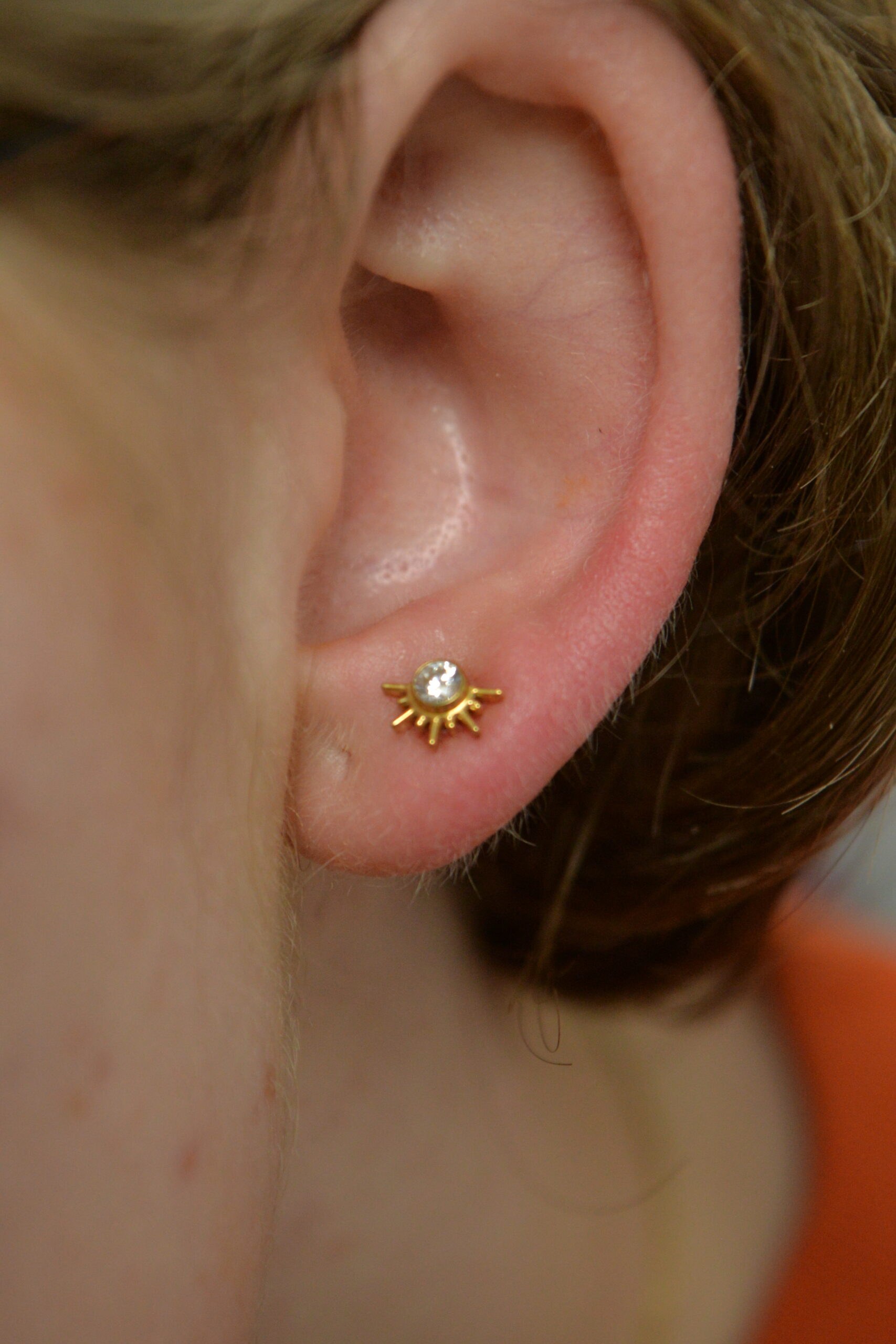 Audacieux et éclatant, le labret titane doré Divine Ray attire la lumière. Ce bijou de grade implantable arbore un zircon central entouré de fines tiges rayonnantes qui rappellent les éclats du soleil. Disponible en titane argenté ou en doré, il illumine le visage d’une touche de luxe minimaliste, parfaite pour un helix, lobe, tragus, flat ou conch, médusa, narine (en 1.2mm).