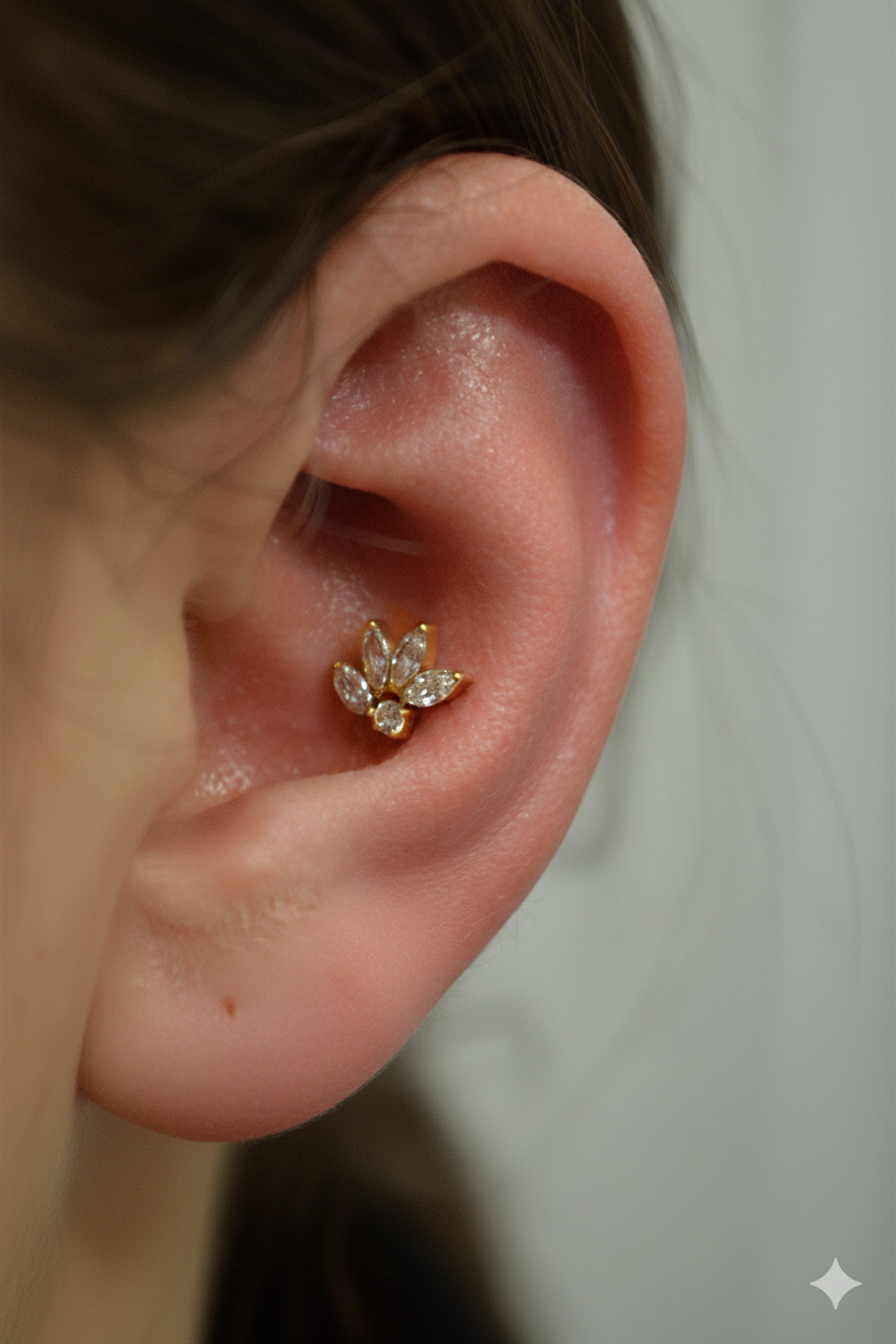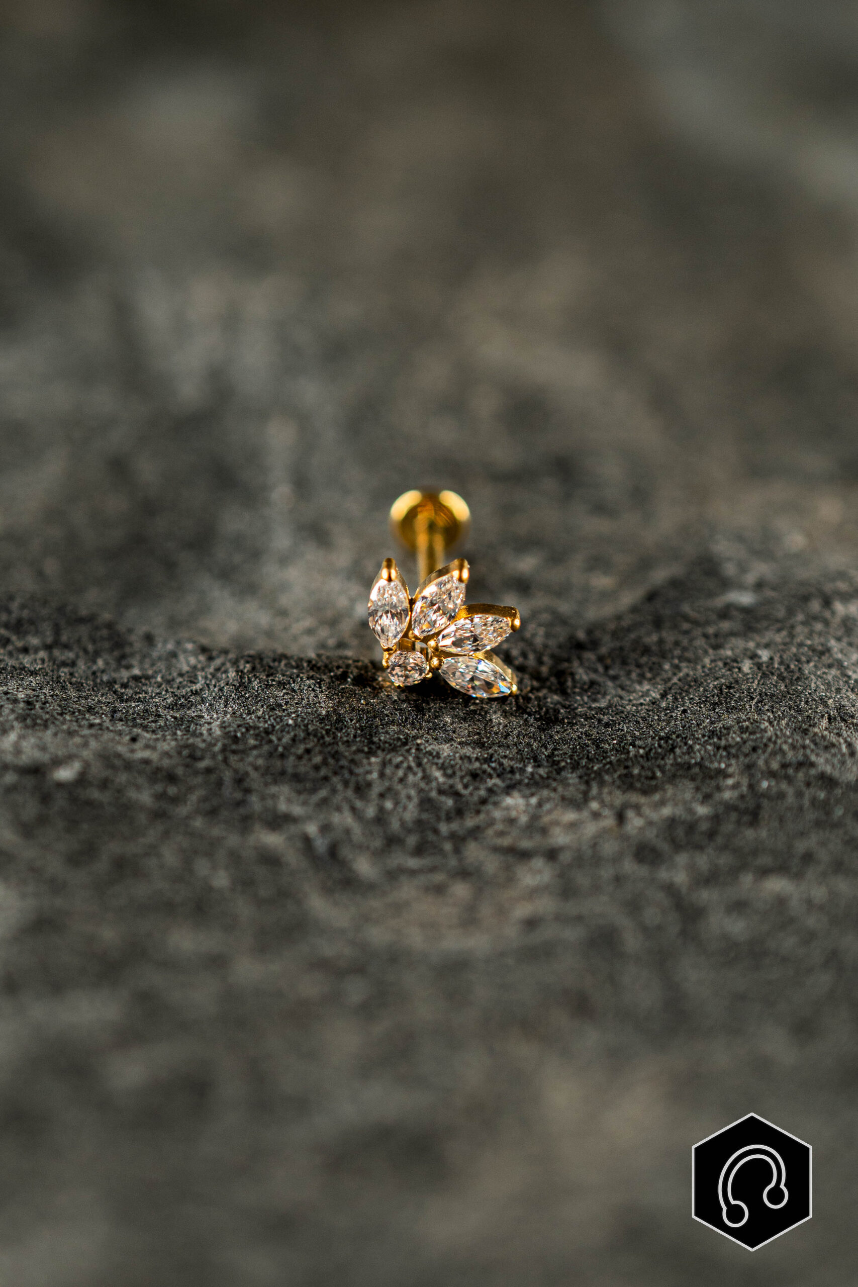 Sa finition dorée apporte une touche élégante et intemporelle, idéale pour sublimer un piercing avec finesse. Léger et agréable à porter, Elmyra Bloom se porte aussi bien seul qu’en accumulation, et s’adapte parfaitement aux piercings du cartilage ou du lobe.