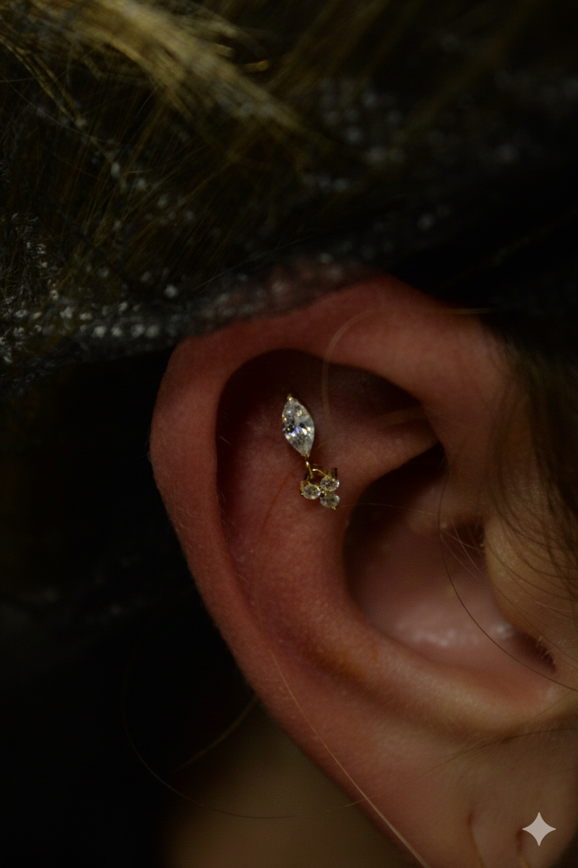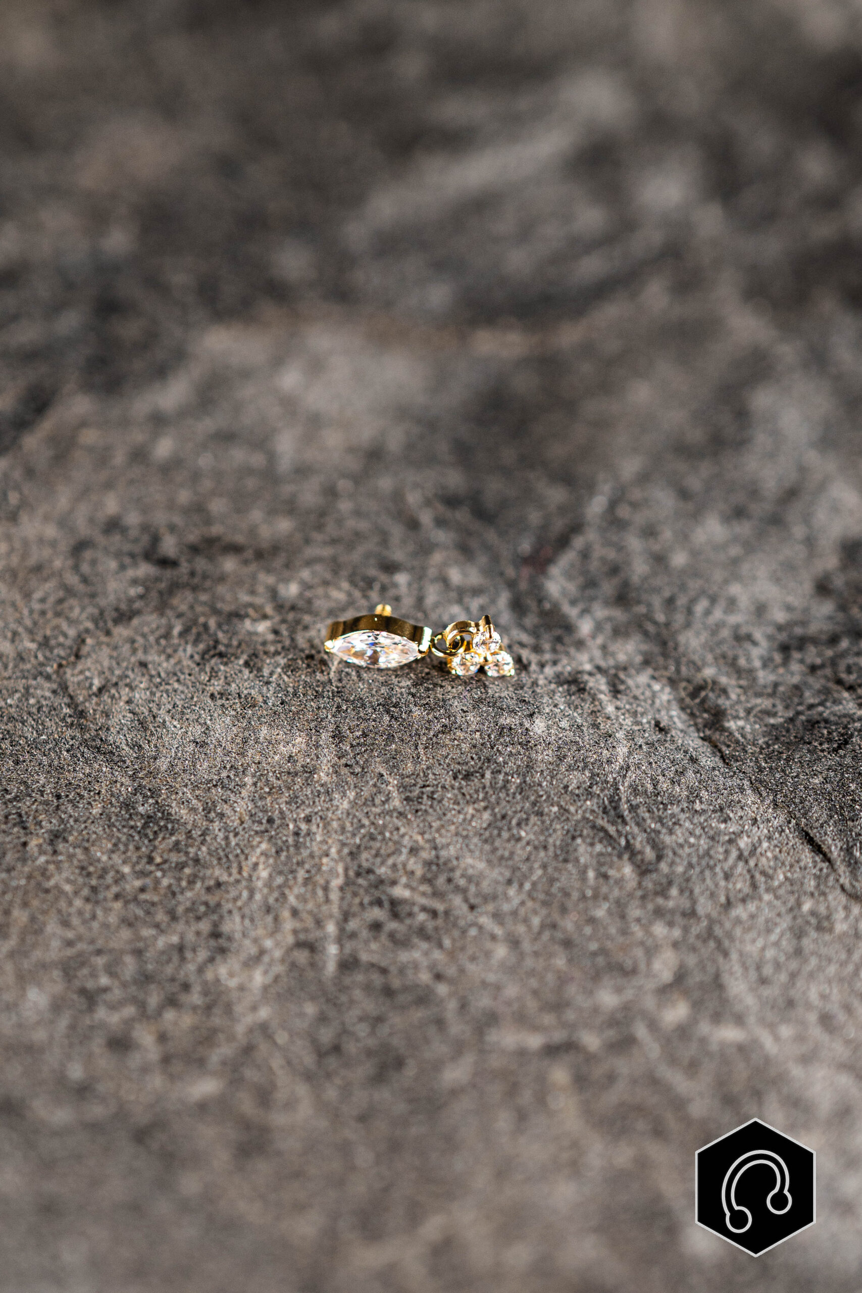 La finition dorée souligne la finesse du design et met en valeur l’éclat des pierres, tout en conservant une esthétique épurée. Ce bijou est idéal pour sublimer les piercings du cartilage ou du lobe, où son pendant attire naturellement le regard tout en restant élégant et équilibré.