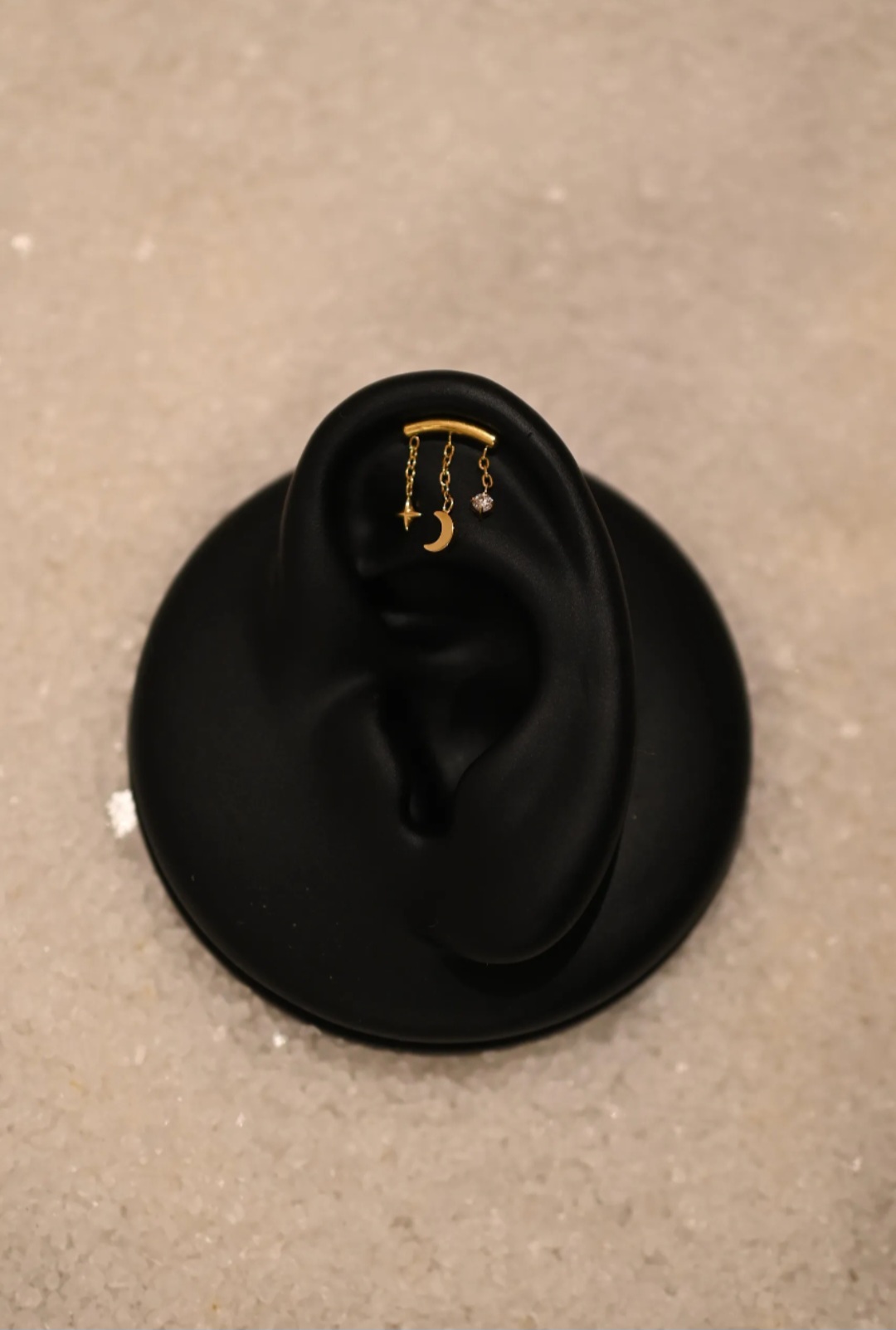 Pensé pour être porté discrètement dans le repli de l’oreille, Hidden Selene laisse apparaître les éléments pendants avec élégance, créant un joli jeu de mouvement et de lumière. La finition dorée apporte une touche chaleureuse et précieuse, idéale pour mettre en valeur le cartilage sans surcharge.