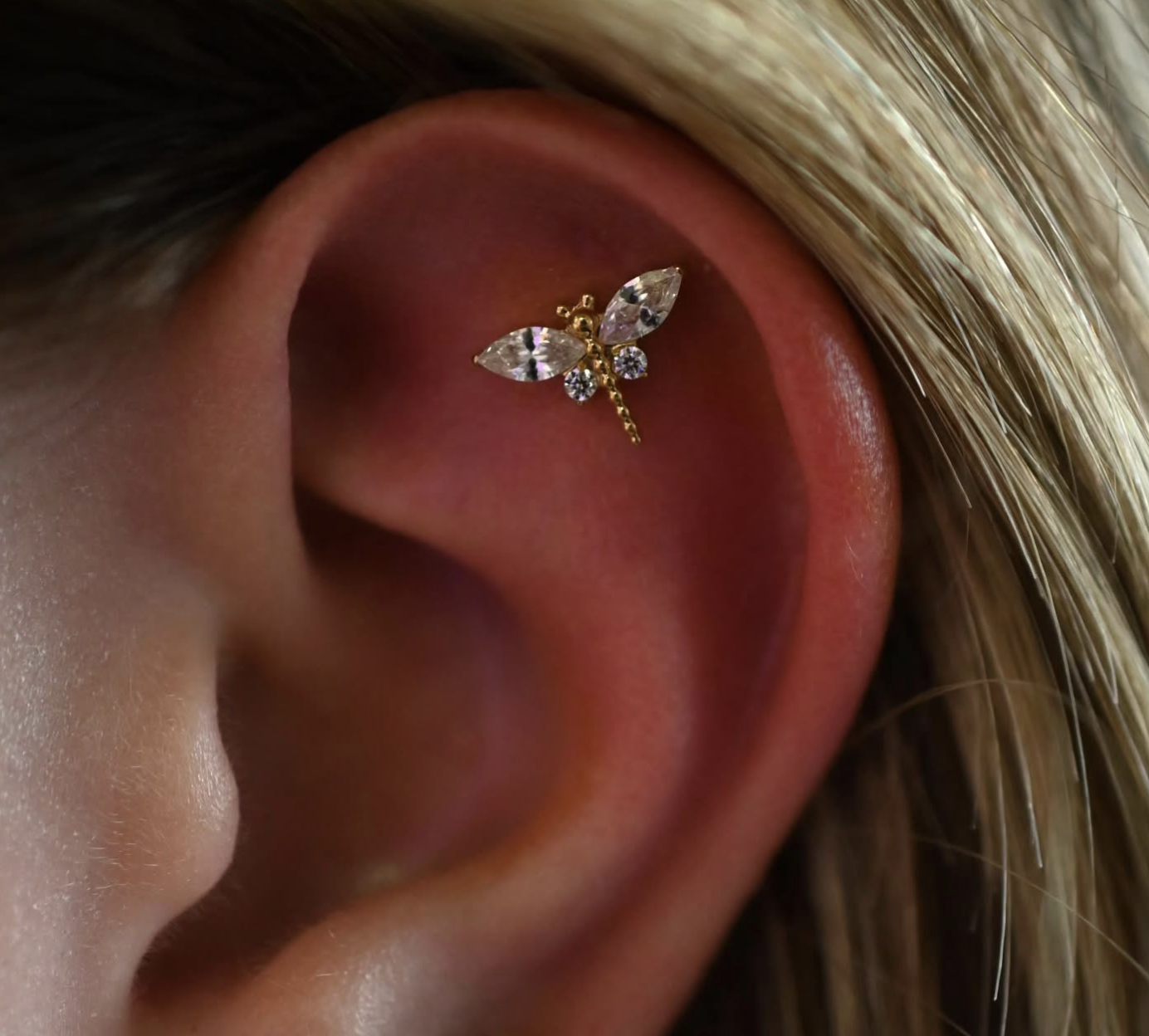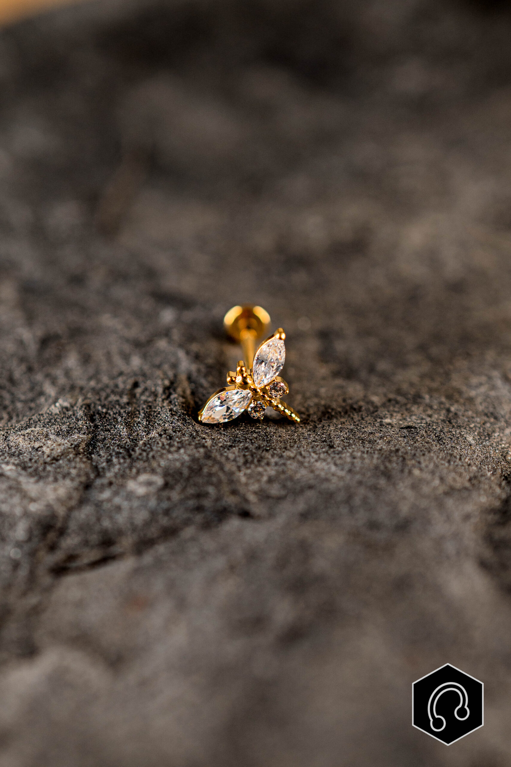 Apportez une touche lumineuse et raffinée à votre piercing avec le labret titane doré Libellia, représentant une fine libellule ornée de zircons clairs. Ses ailes élancées en pierres taille marquise, associées à de petits zircons ronds, créent un jeu de lumière subtil et élégant. Le design finement travaillé met en valeur la silhouette aérienne de la libellule, symbole de légèreté et de finesse. La composition reste harmonieuse et équilibrée, idéale pour illuminer l’oreille.