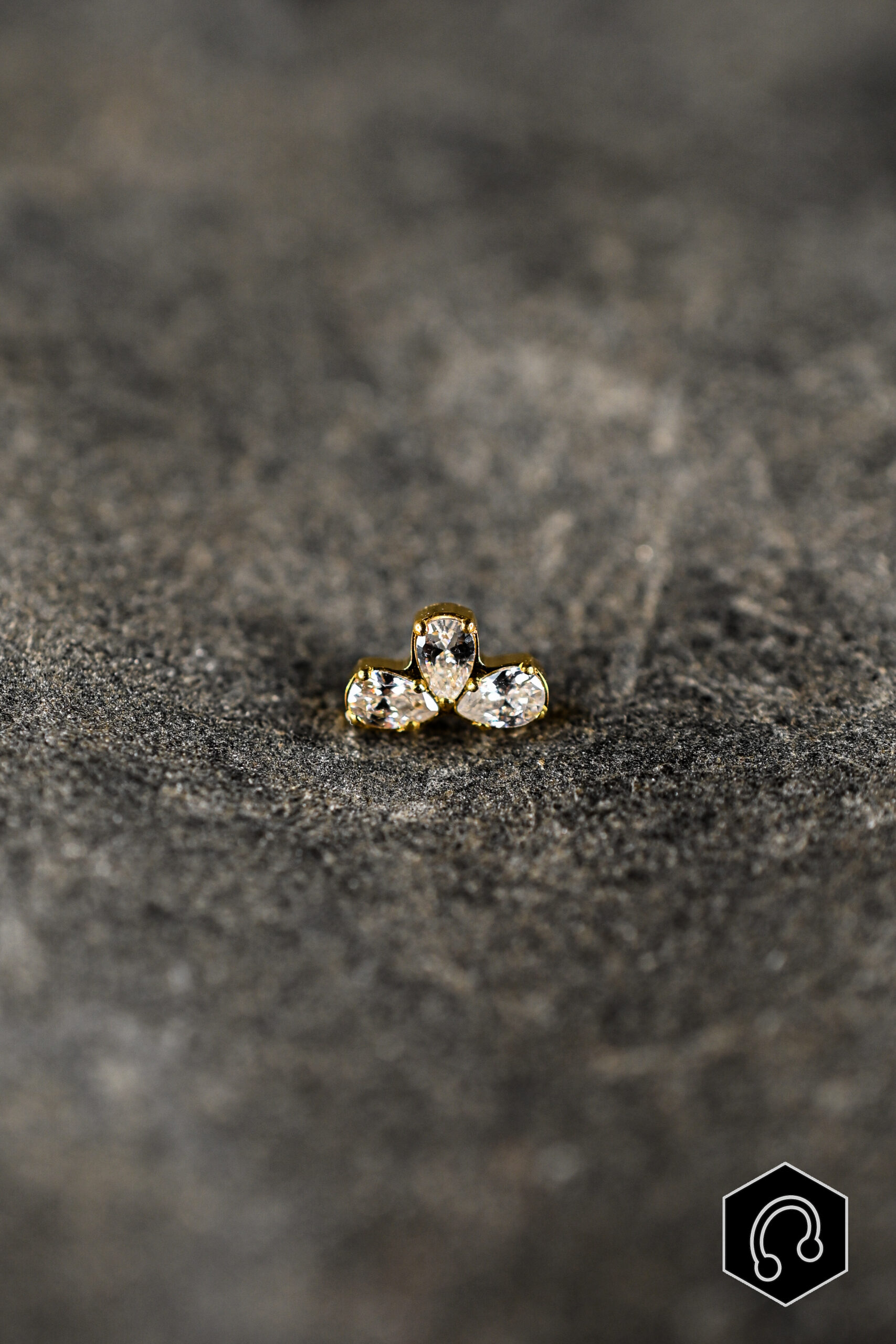 Le labret titane doré Petal Kiss séduit par son design floral formé de trois zircons taillés en gouttes. L’agencement élégant rappelle une fleur en plein épanouissement, apportant une touche lumineuse et sophistiquée à vos piercings. Fabriqué en titane hypoallergénique de qualité professionnelle, il garantit confort, sécurité et durabilité pour un port quotidien.