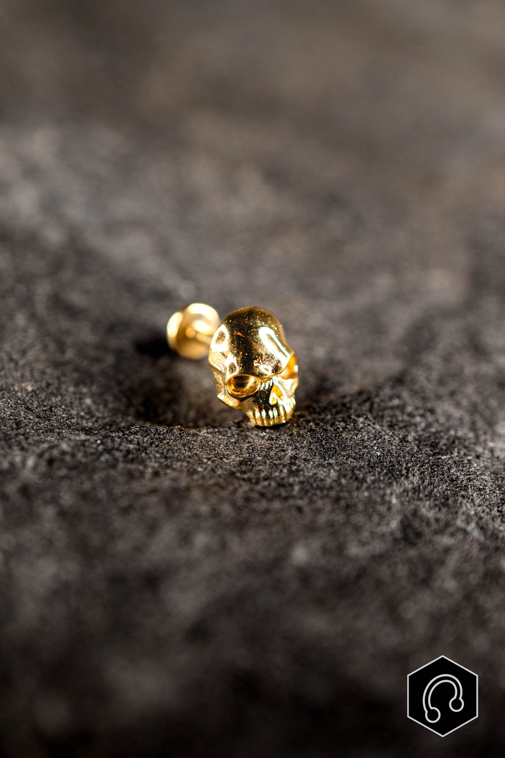 Le labret titane doré Skull Aura affirme un style fort et assumé grâce à son motif tête de mort finement travaillé. Les détails sculptés du crâne apportent du relief et du caractère, tout en conservant une finition lisse et brillante qui lui donne un rendu élégant.