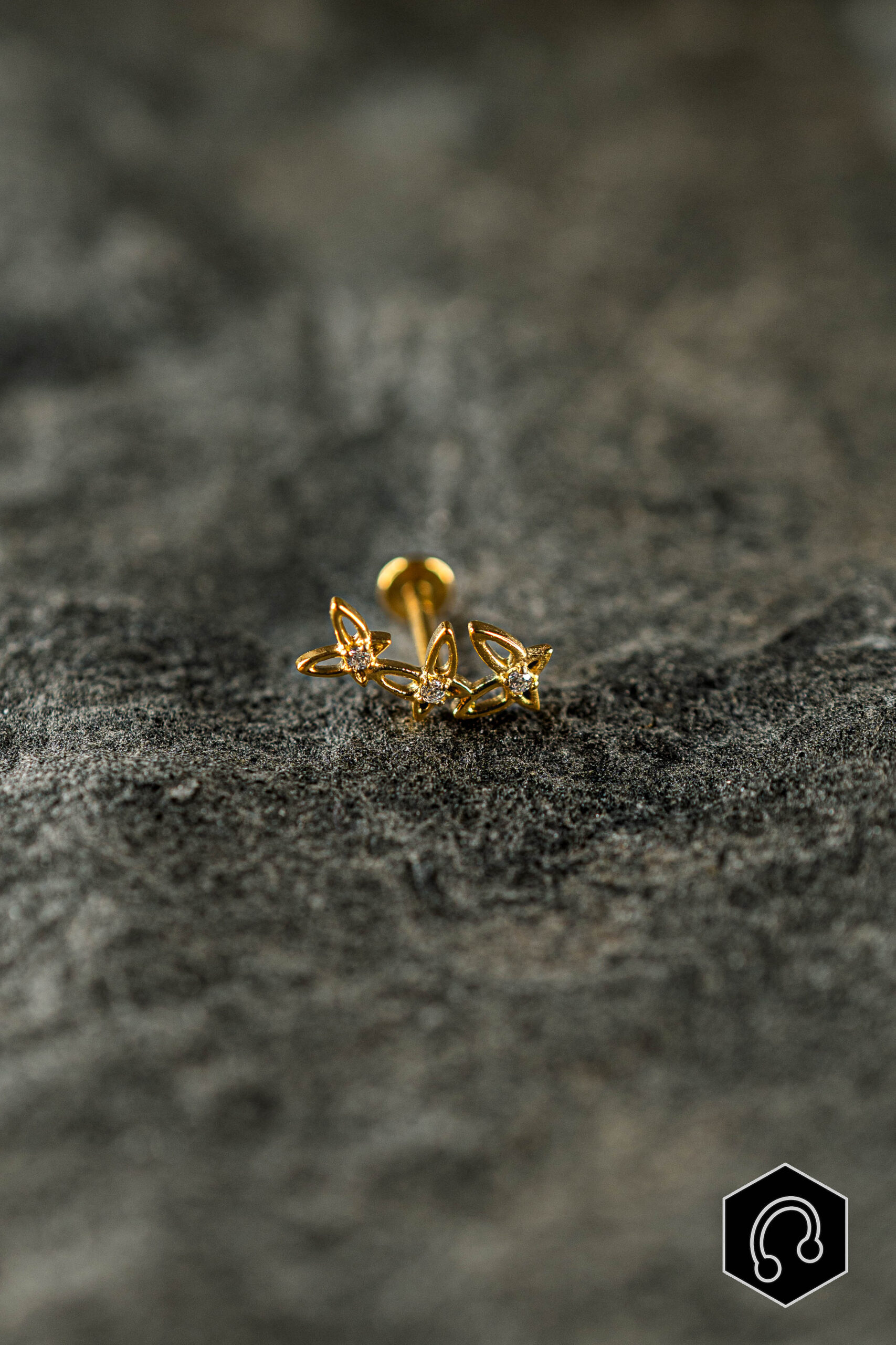 Le labret titane doré Sylva Bloom séduit par son design délicat inspiré de la nature. Ses trois papillons rehaussées de petits zircons lumineux, apportent une touche fraîche et élégante à votre piercing.