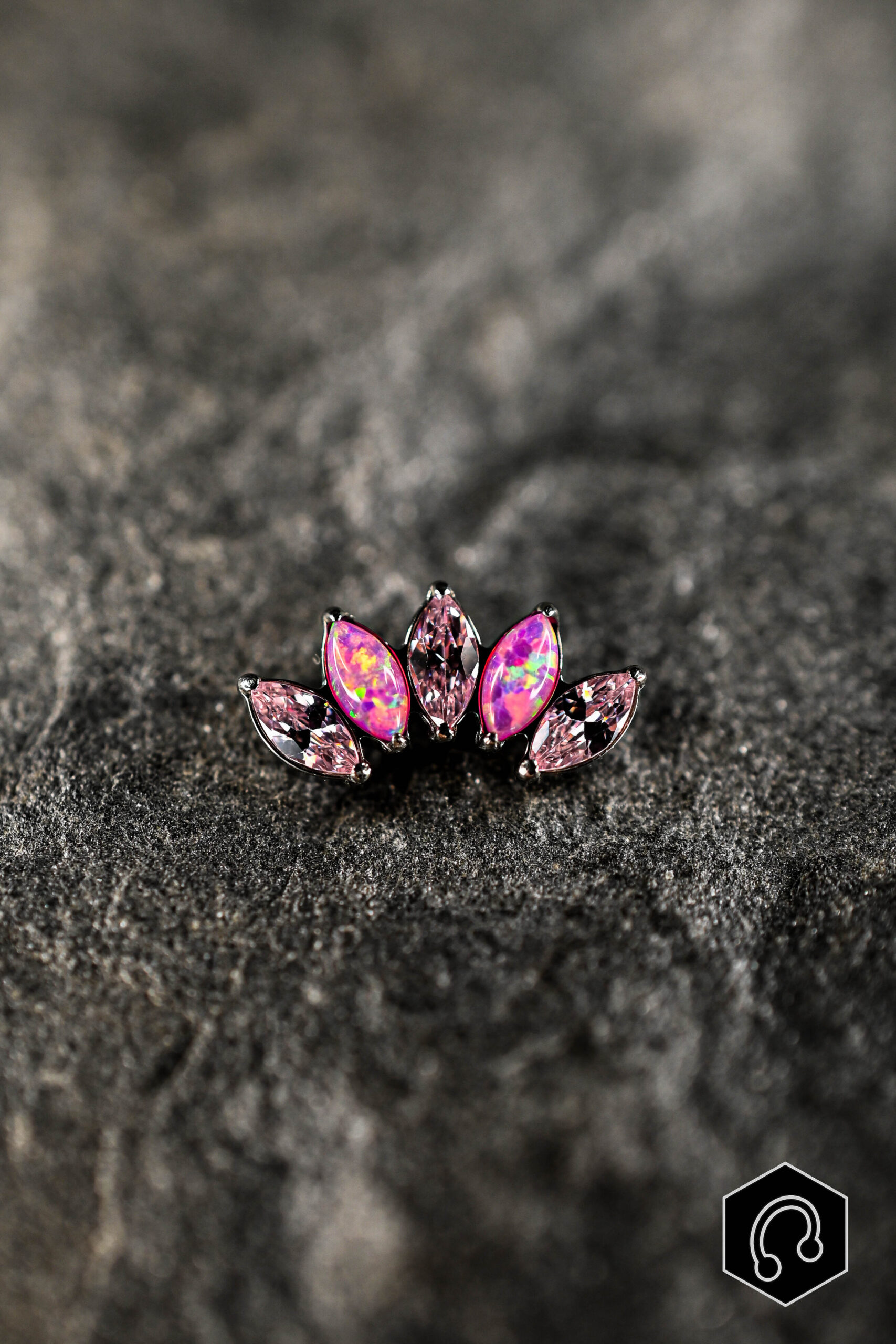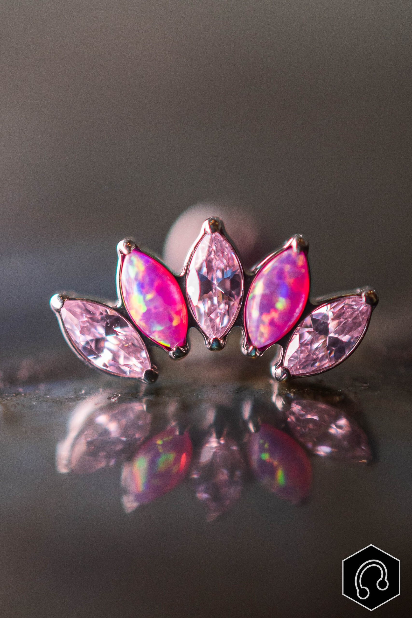 Ce labret en titane de qualité implantable allie légèreté, résistance et élégance. Son design en éventail met en valeur deux opales synthétiques aux reflets envoûtants, encadrées de zircons forme marquise au rose délicat. Chaque pierre capte la lumière avec magie, évoquant une fleur en pleine éclosion.