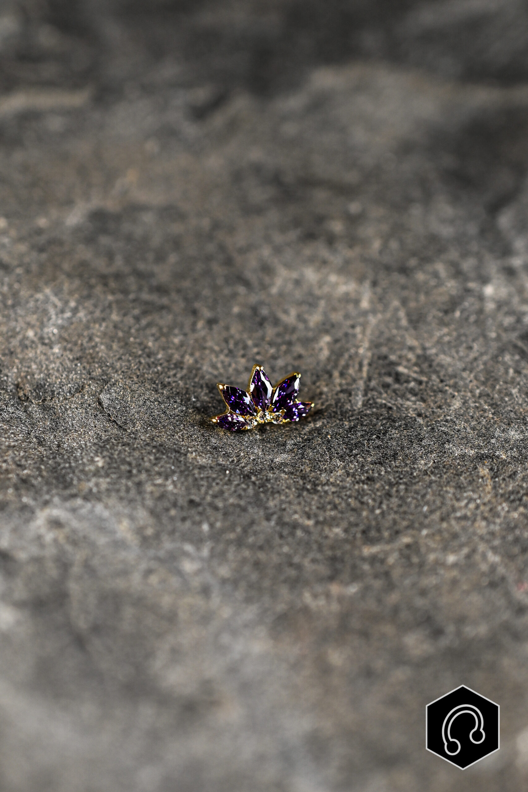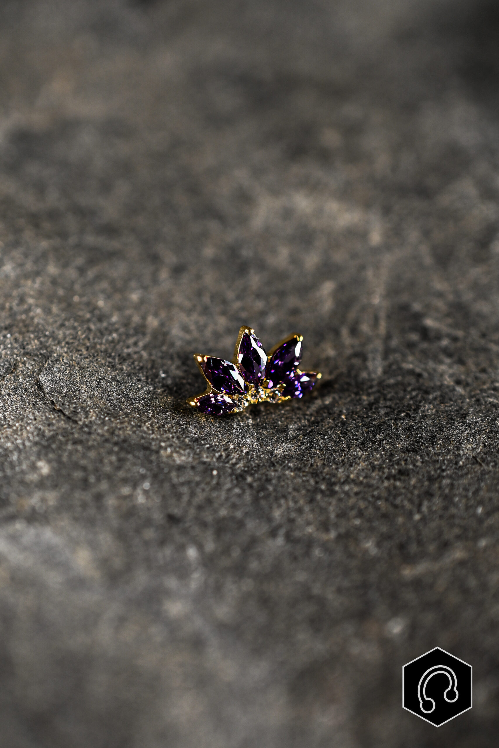 Orné de cinq pierres d’un violet intense, disposées en éventail pour former une fleur flamboyante. Crimson Bloom est idéal pour sublimer votre oreille. Trois zircons cristallins ajoutent une touche d’éclat qui contraste magnifiquement avec la profondeur du violet.