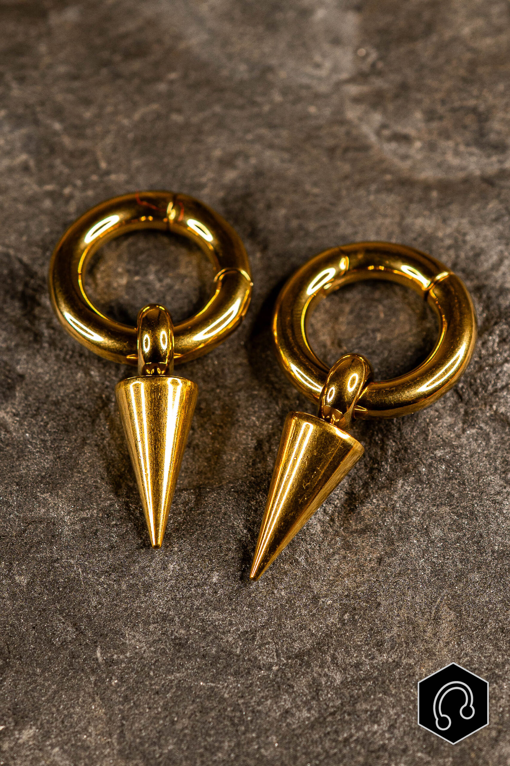Affirmez votre style avec ce poids d’oreille doré au design audacieux. Son anneau massif et lisse s’associe à un pendentif conique parfaitement poli, créant un contraste puissant entre rondeur et pointe.